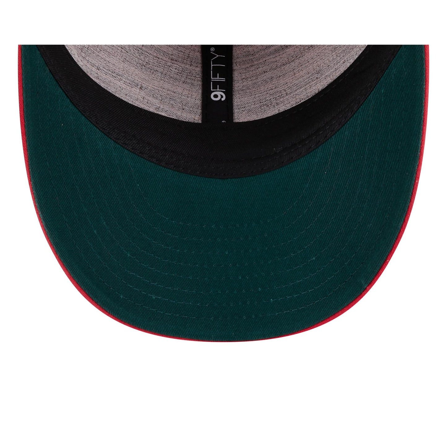 The Kansas City Chiefs Canvas Felt Retro Crown 9FIFTY Strapback Cap features an embroidered Chiefs logo at the front panels with a matching NFL Shield at the right rear. Additional details include an adjustable D-Ring closure at the rear and a green undervisor.