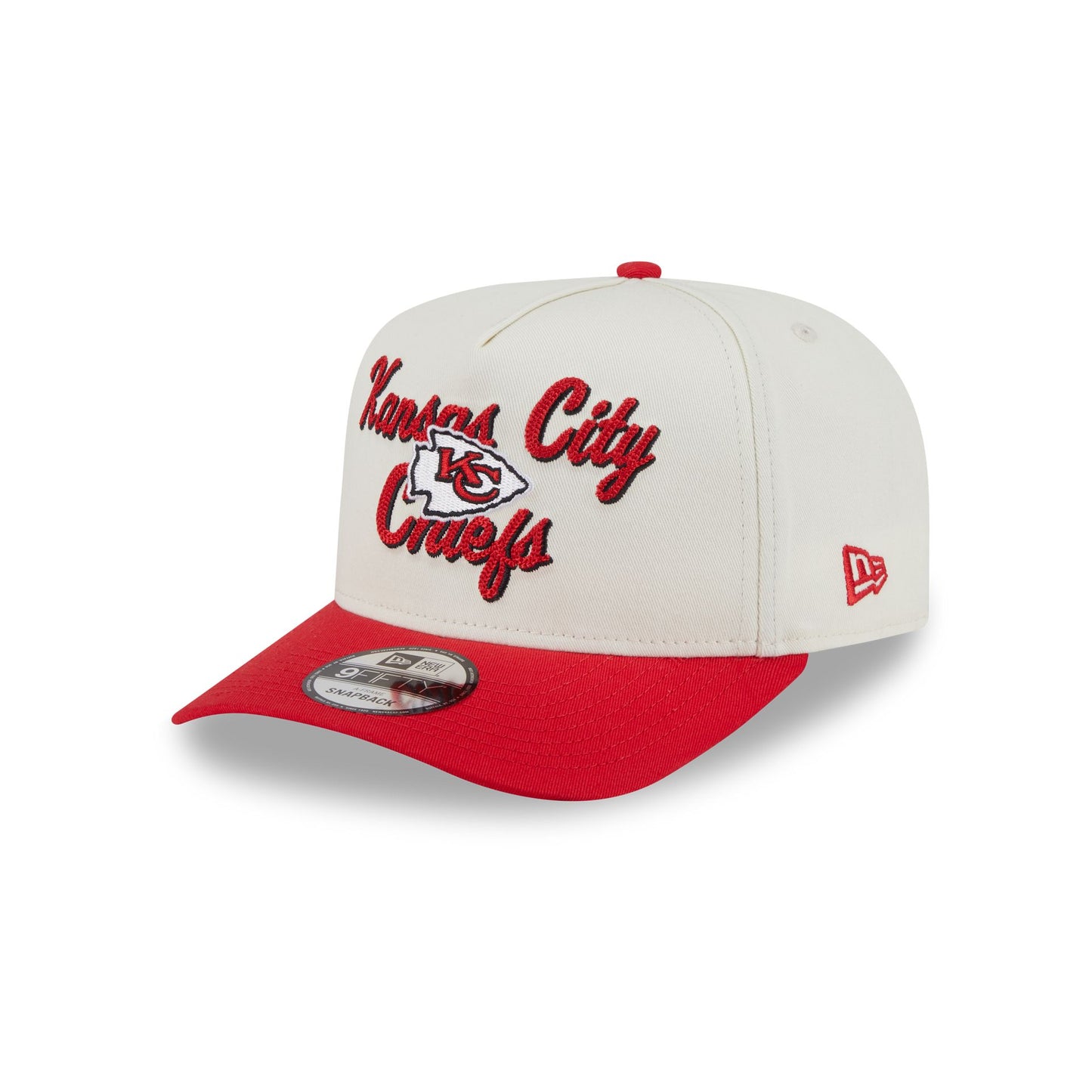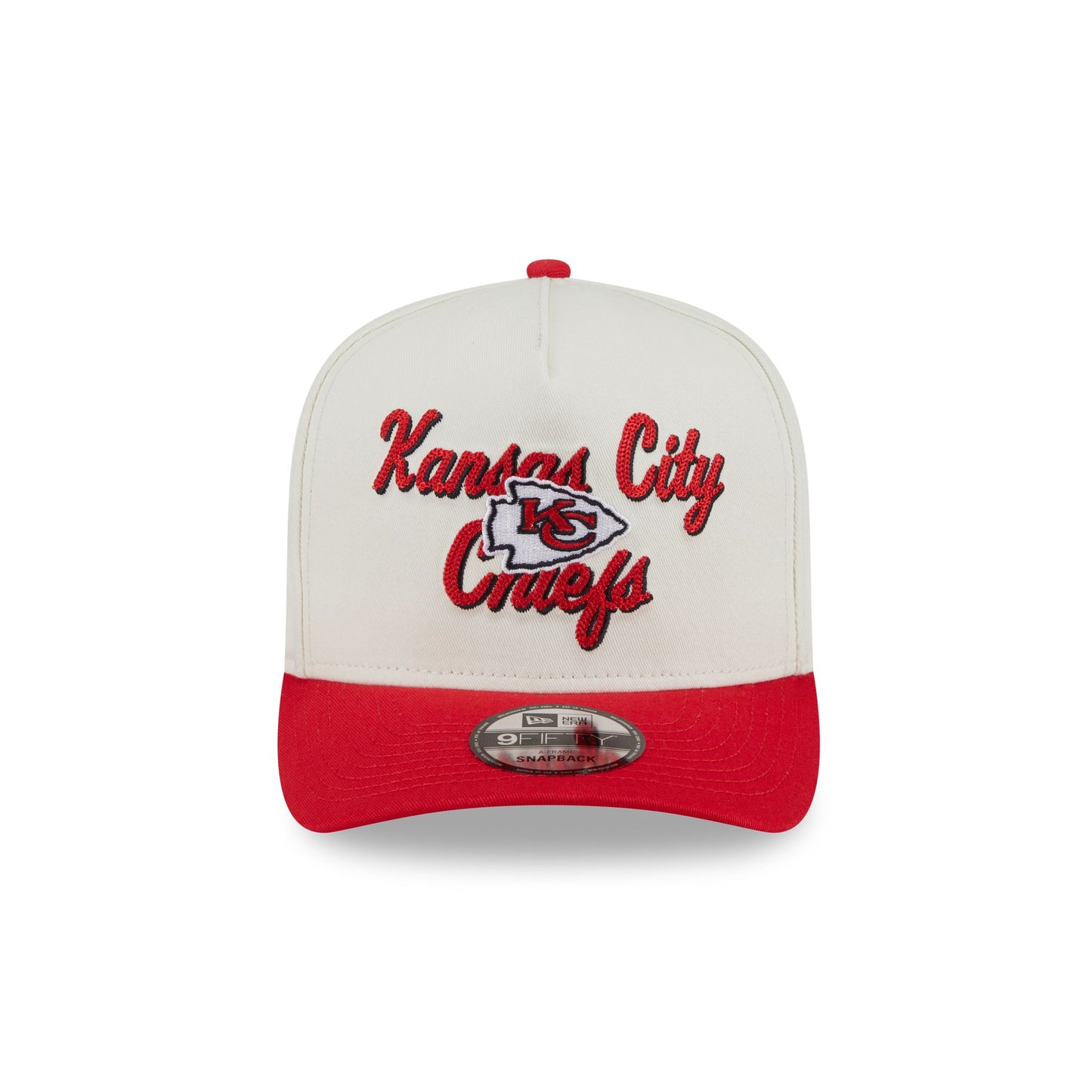 The Kansas City Chiefs Chainstitch 9FIFTY A-Frame Snapback features a chainstitch Chiefs logo and script wordmark at the front panels with a snapback closure at the rear and a gray undervisor.
