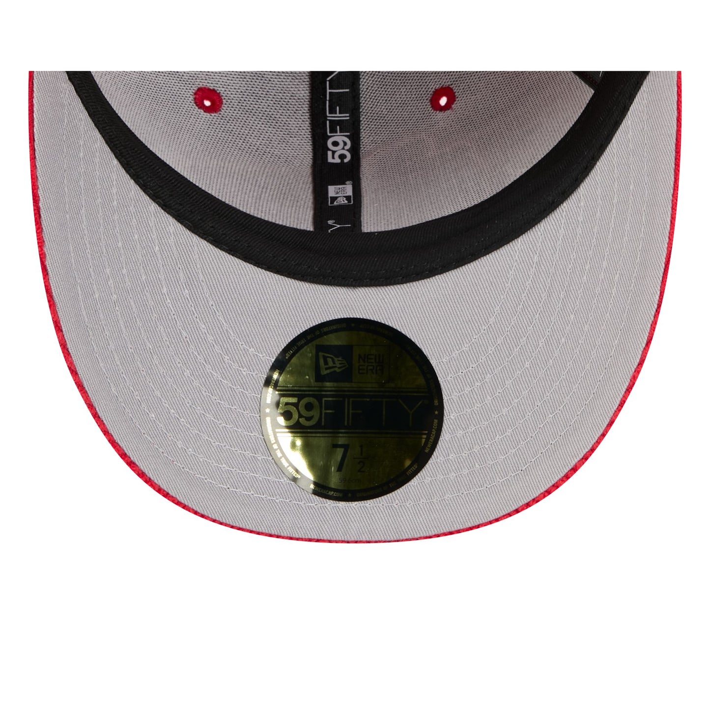 The Kansas City Chiefs Chenille Pop 59FIFTY Fitted Cap features an embroidered Chiefs chenille logo at the front panels with a soft striped fabric throughout the cap. Additional details include a matching NFL Shield logo at the rear and a gray undervisor. This cap comes with a pre-curved visor.