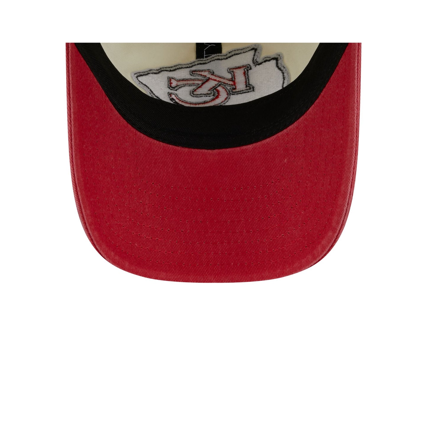 The Kansas City Chiefs Classic Sidescript 9TWENTY Adjustable Cap features an embroidered Chiefs logo at the front panels with a matching team wordmark at the right-wear side. Additional details include eyelets throughout the cap and an adjustable D-Ring closure at the rear.