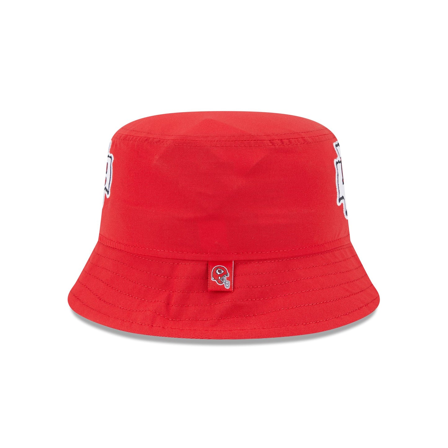 The Kansas City Chiefs Helmet Bucket Hat features an embroidered Chiefs helmet design throughout.