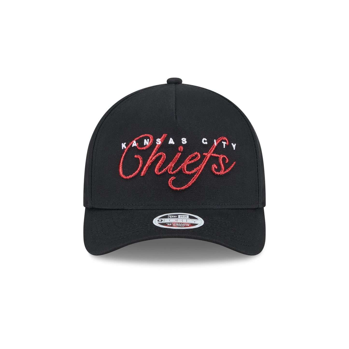 The Kansas City Chiefs Metallic Women's 9FORTY M-Crown A-Frame Snapback features an embroidered Chiefs metallic script wordmark at the front panel with a snapback closure at the rear and a satin undervisor.