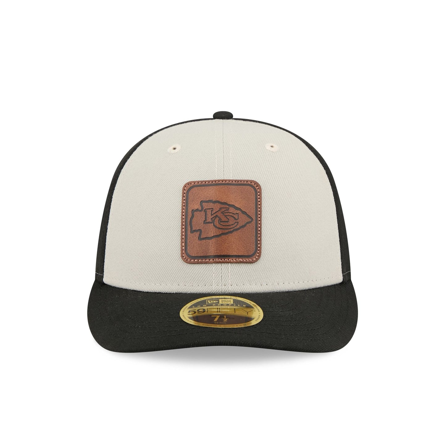 The Kansas City Chiefs Quilted Low Profile 59FIFTY Fitted Cap features a faux leather debossed applique Chiefs patch at the front panels with a matching 60 Seasons team patch at the right-wear side and an embroidered NFL Shield at the rear.