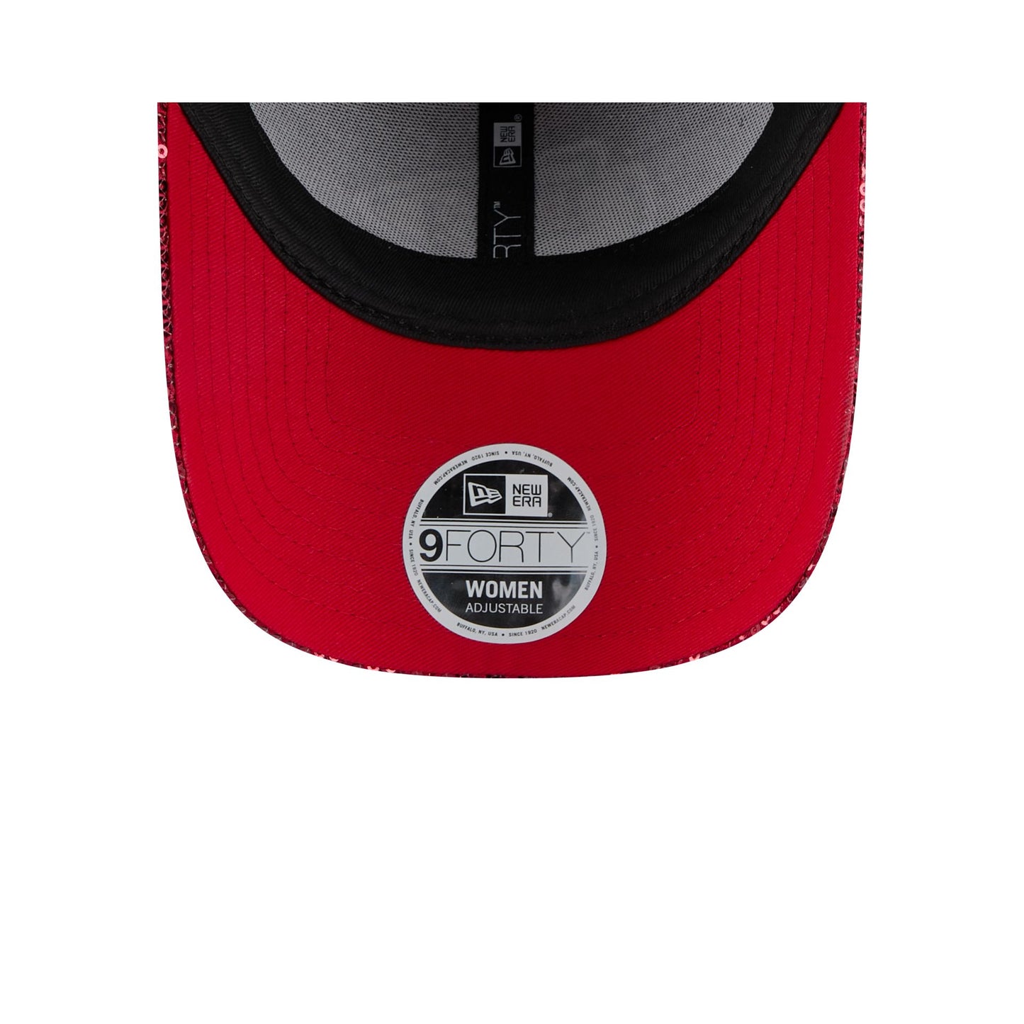 The Kansas City Chiefs Sequin Women's 9FORTY Adjustable Cap features an embroidered Chiefs logo at the front panels with sequins throughout the cap and an adjustable hook-and-loop closure at the rear.