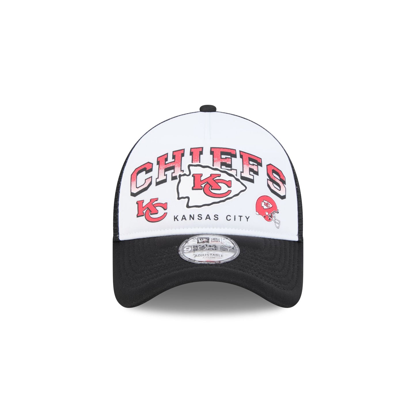 The Kansas City Chiefs Sport Classics 9FORTY A-Frame Trucker features a retro screen-printed Chiefs wordmark at the front panels with a team logo at the left and an team helmet at the right. Additional details include a mesh back, a gray undervisor, and a snapback closure at the rear.