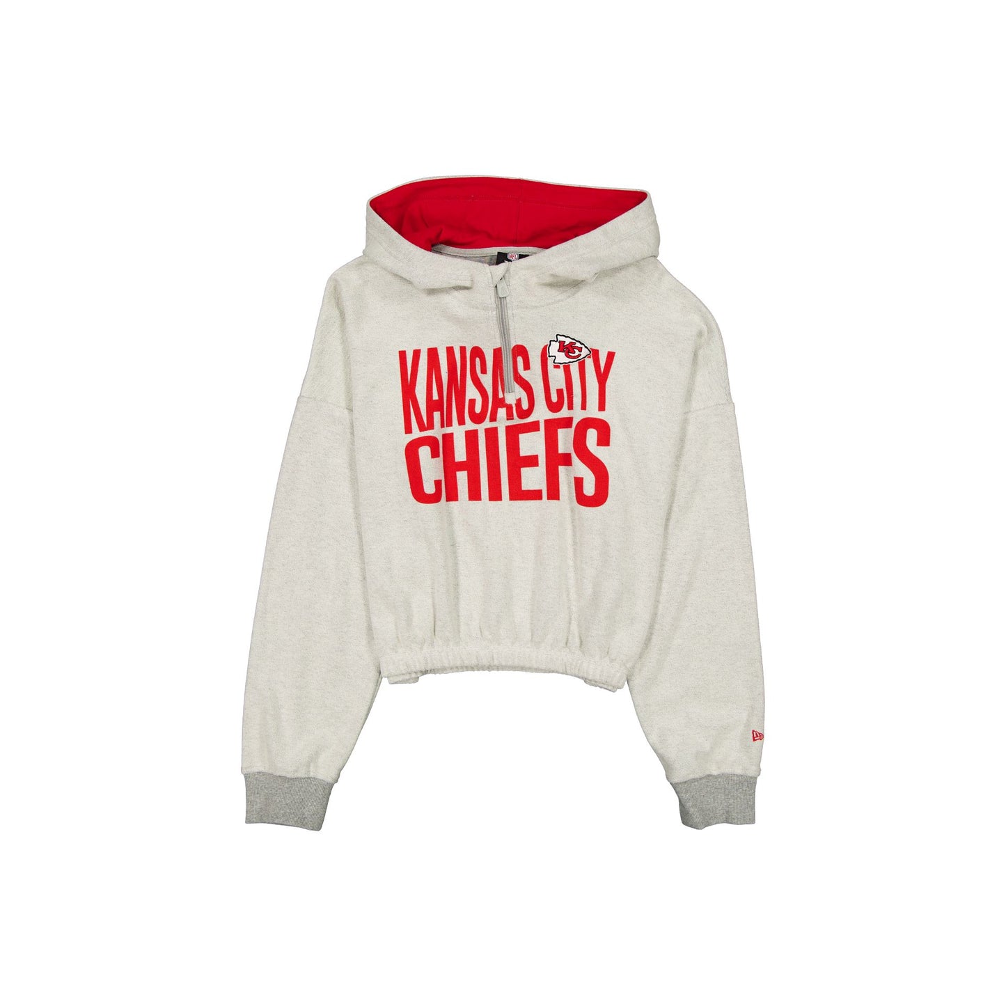 The Kansas City Chiefs Sport Night Heather Gray Women's Hoodie features a screen-printed Chiefs wordmark at the front with an embroidered team logo at the left chest. Additional details include a quarter-zip closure and an elastic waistband.
