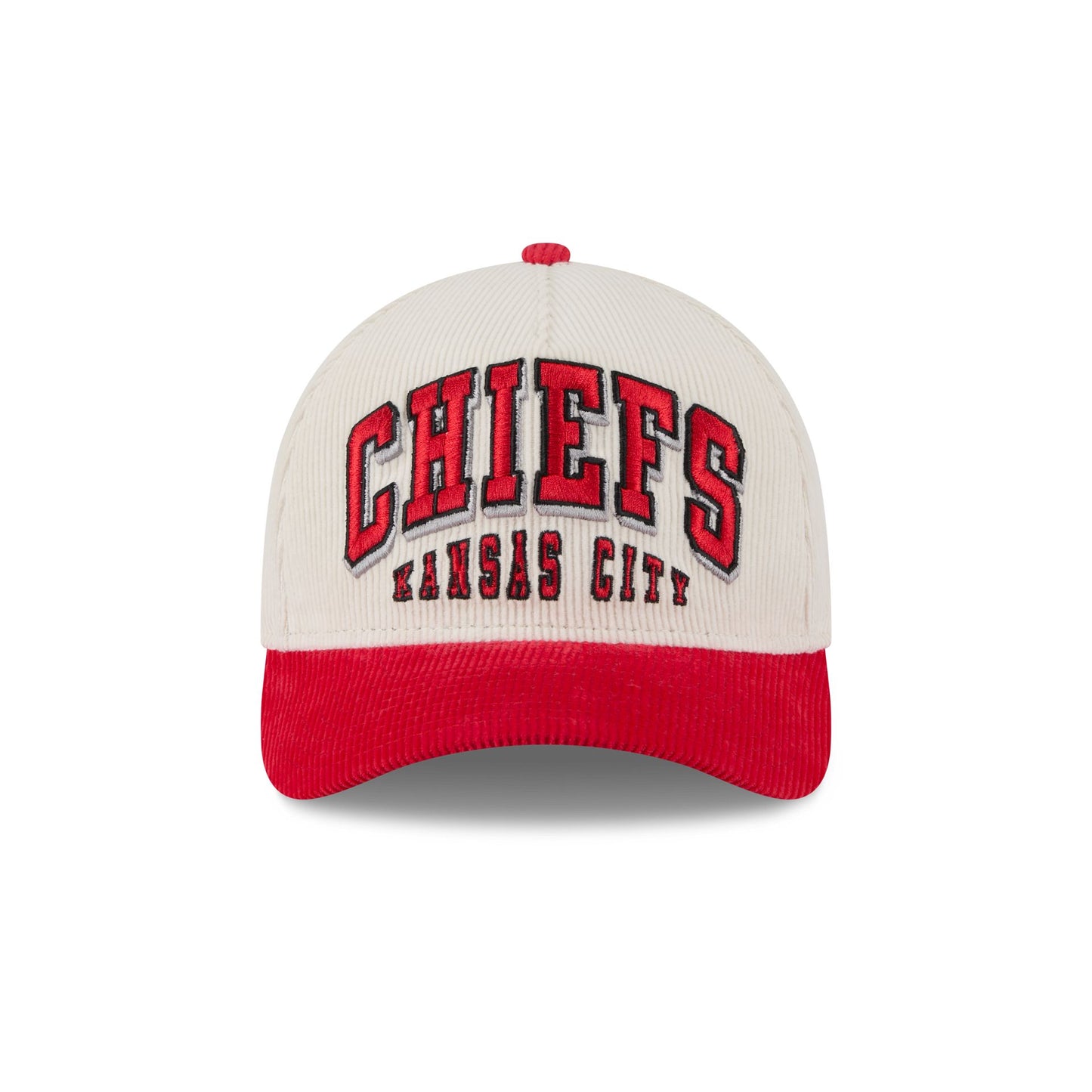 The Kansas City Chiefs Stacked Corduroy 9FORTY M-Crown A-Frame Snapback features an embroidered Chiefs stacked wordmark at the front panels with a logo at the right-wear side. Additional details include a corduroy fabrication throughout, a snapback closure at the rear, and a gray undervisor.