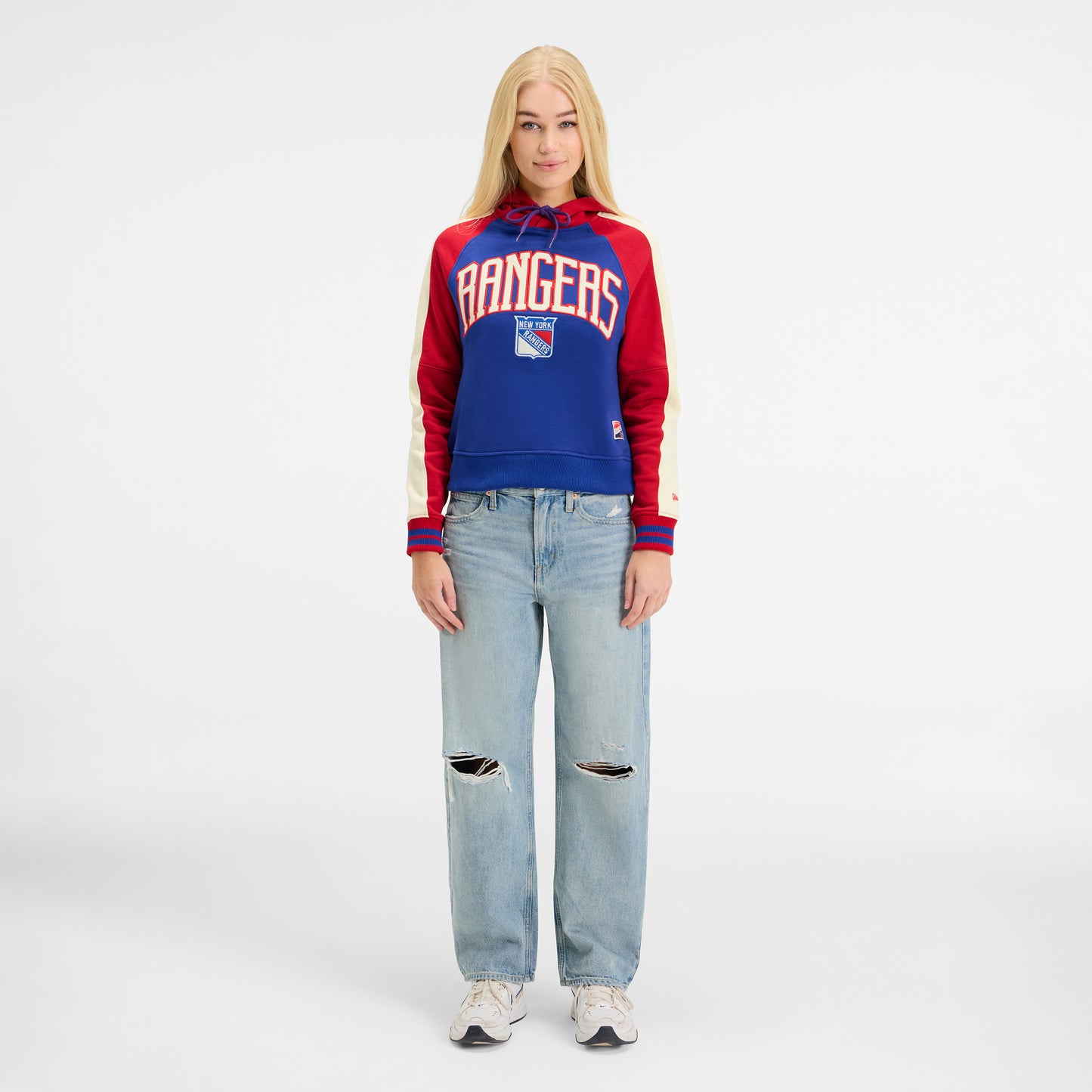 The Kansas City Chiefs Throwback Women's Hoodie features a twill applique Chiefs wordmark above an embroidered team logo at the front. Additional details include adjustable drawstrings at the hood and a New Era jock tag at the left hip.