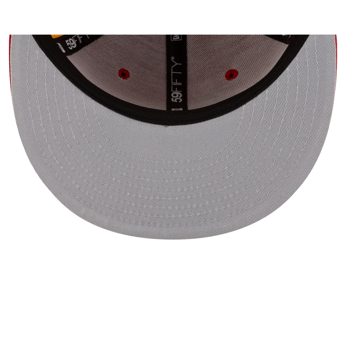 The Kansas City Chiefs Two-Tone Pinwheel 59FIFTY Fitted Cap features an embroidered Chiefs logo at the front panels with a matching team wordmark at the rear. Additional details include a red and yellow paneled crown with a 50th Anniversary patch at the right-wear side and a gray undervisor.