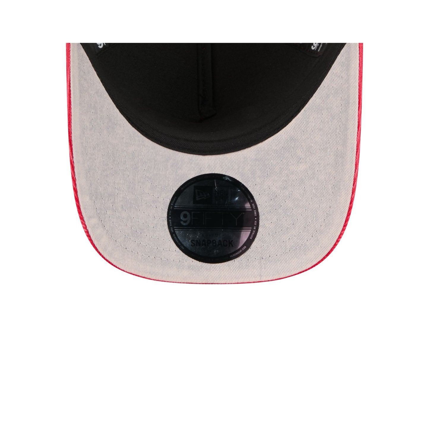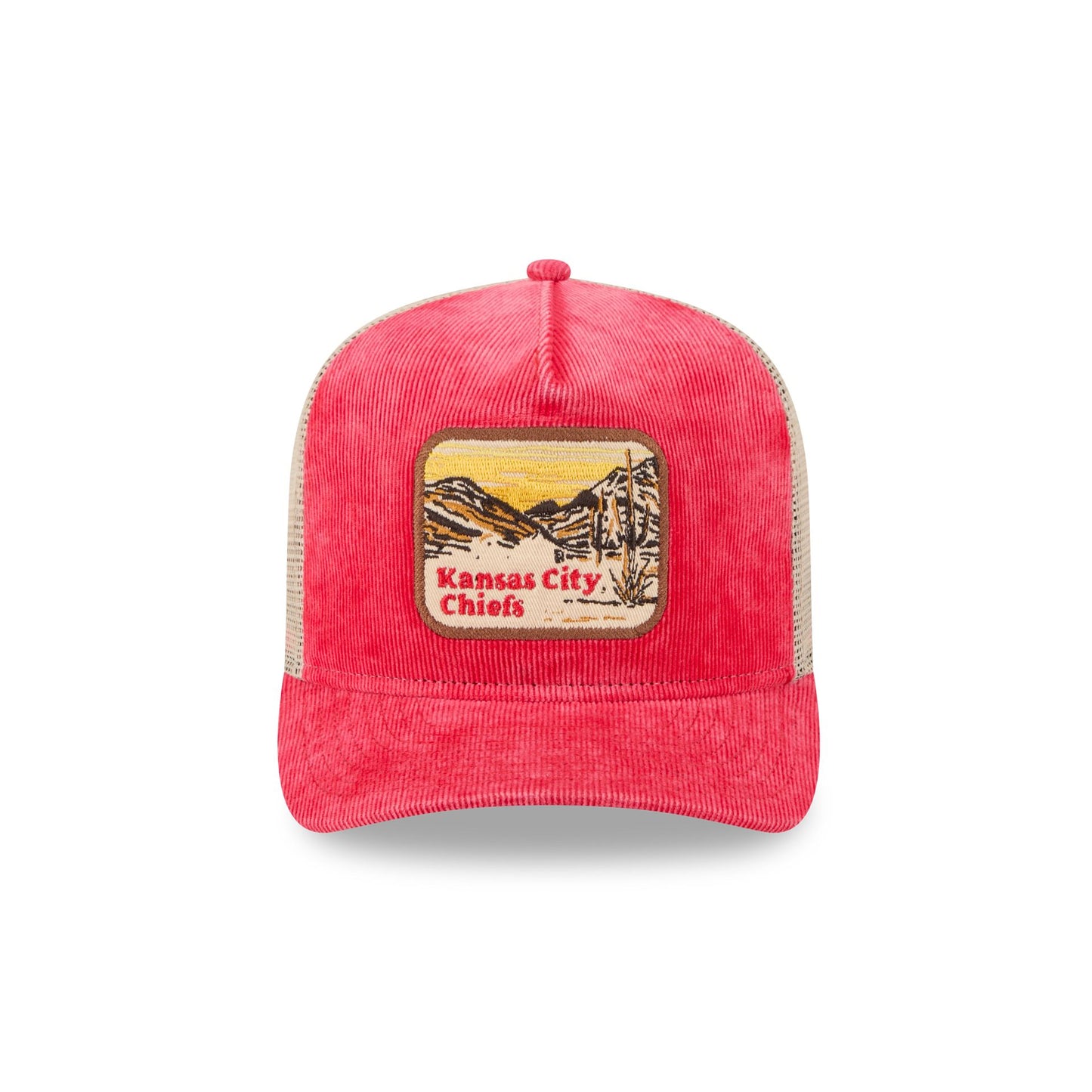 The Kansas City Chiefs Vintage Landscape 9FIFTY A-Frame Trucker features an embroidered Chiefs Vintage Landscape patch at the front panels with a team logo at the right-wear side. Additional details include an adjustable snapback closure at the rear and a gray undervisor.