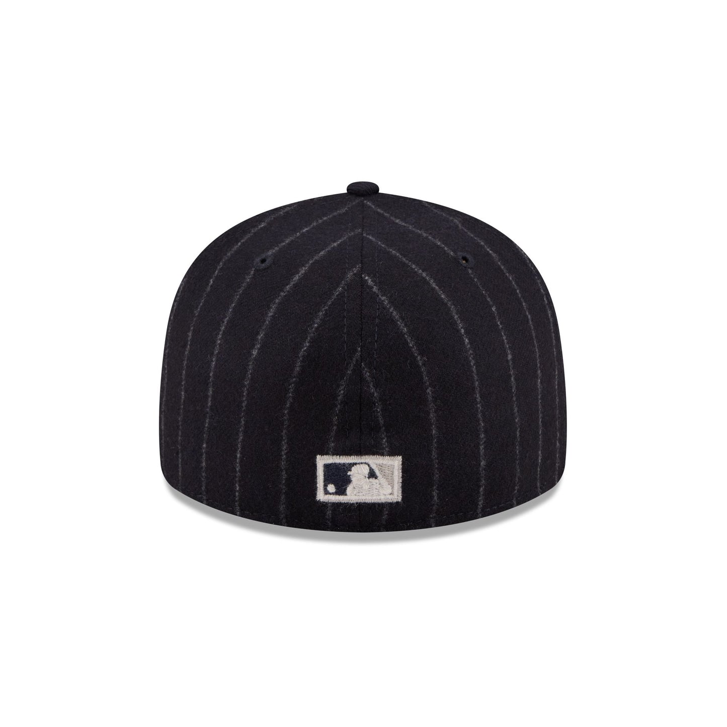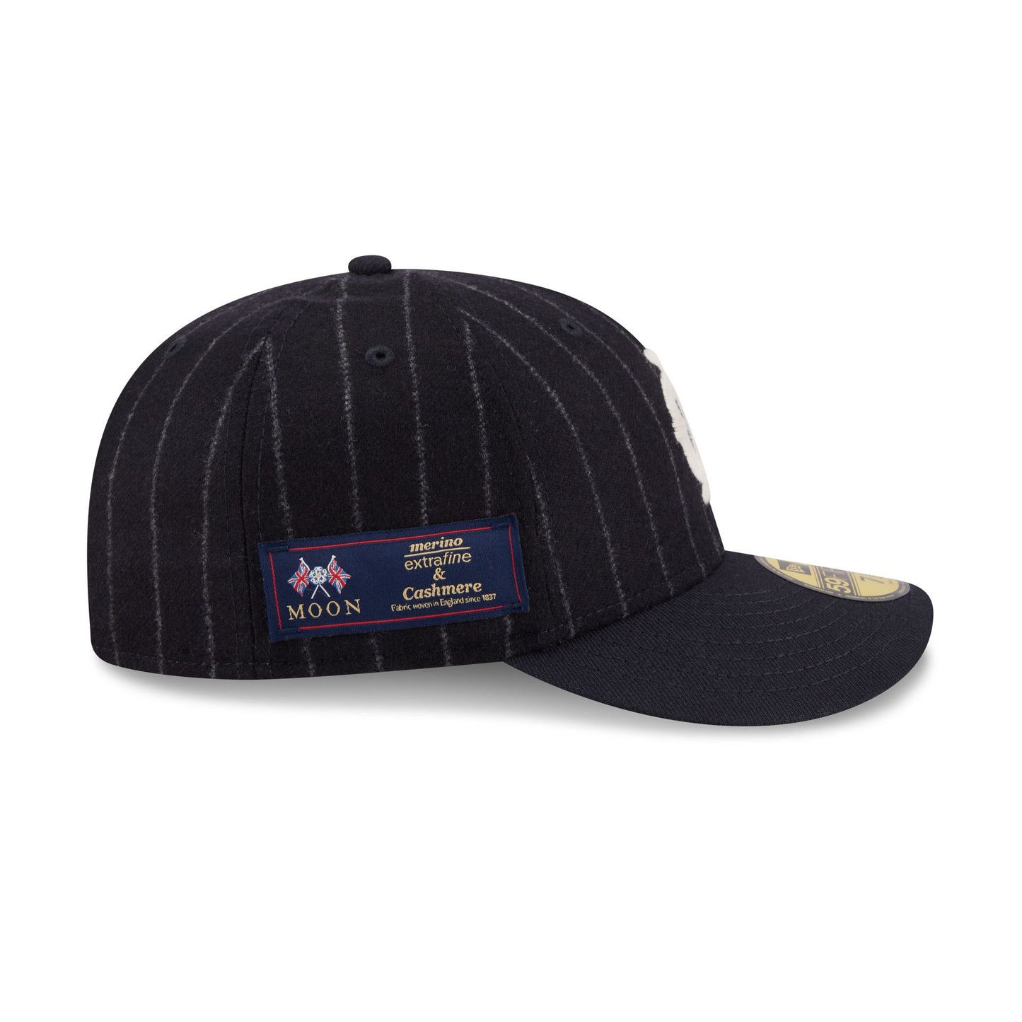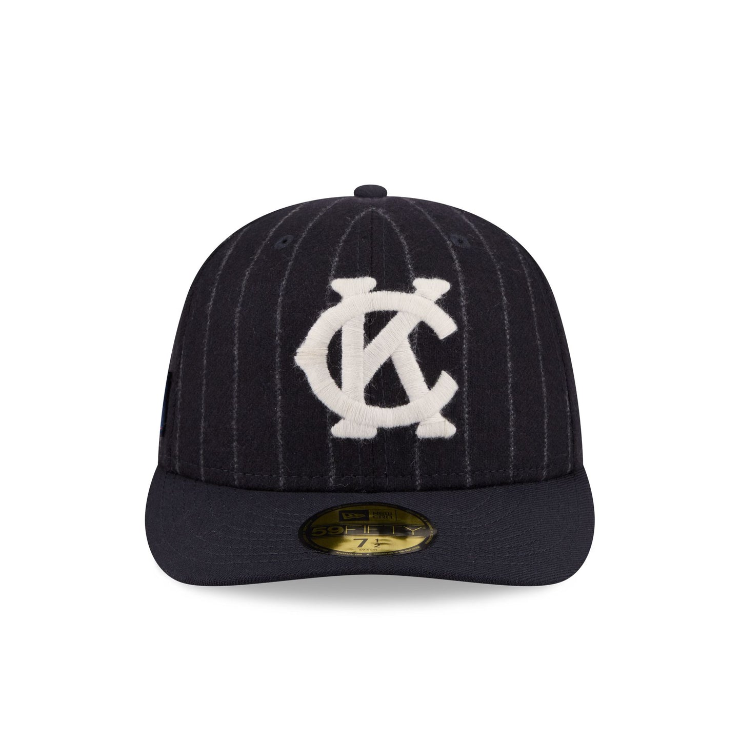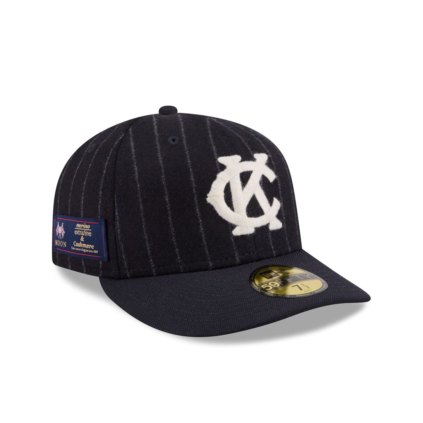 The Kansas City Monarchs Pinstripe Merino & Cashmere Moon 59FIFTY Fitted Cap features an embroidered Monarchs logo at the front panels with a Merino and cashmere Moon fabrication throughout and a satin Moon tag woven to the right-wear side. Additional details include the MLB Batterman logo at the rear and a green undervisor. This cap comes with a pre-curved visor.