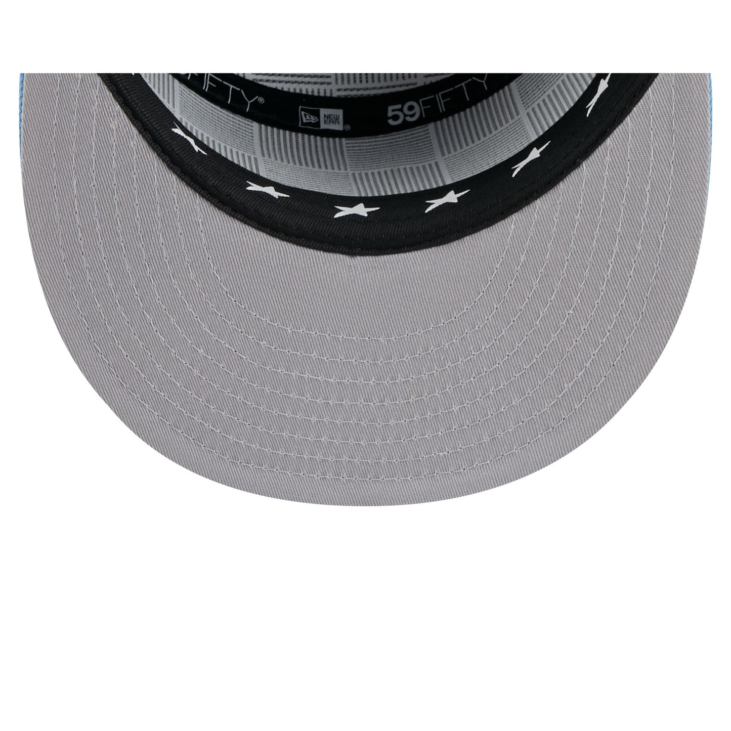 The Kansas City Royals 2025 All-Star Game Split Panel 59FIFTY Fitted Cap features an embroidered Royals logo at the front panels against a split-crown construction with breathable mesh fabric at the side and rear panels. Additional details include stars at the top panel, a 2025 All-Star Game patch at the right-wear side, the MLB Batterman logo at the rear, and a gray undervisor. The cap also features screen-printed stars on the sweatband.