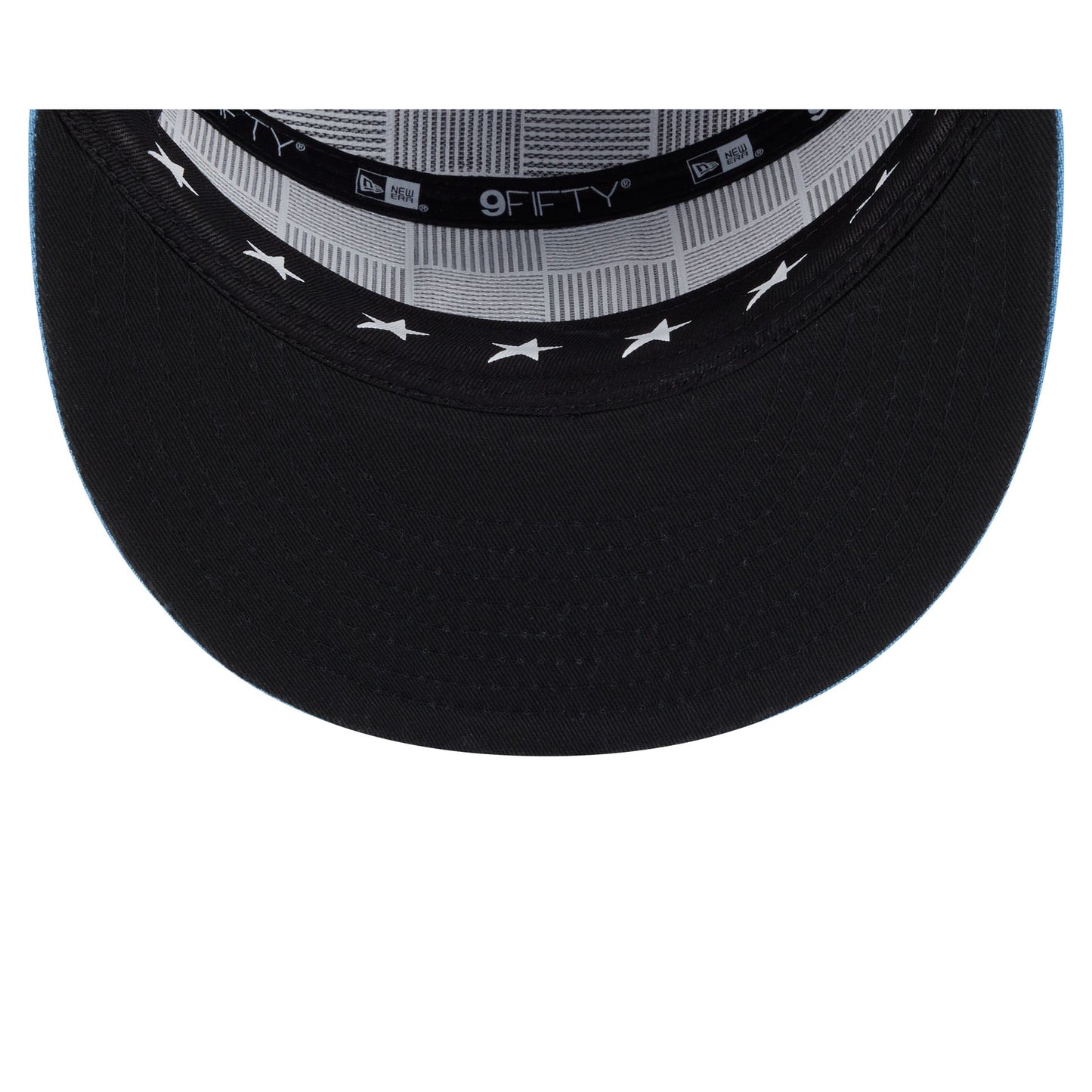 The Kansas City Royals 2025 All-Star Game Split Panel 9FIFTY Snapback features an embroidered Royals logo at the front panels against a split-crown construction with breathable mesh fabric at the side and rear panels. Additional details include stars at the top panel, a 2025 All-Star Game patch at the right-wear side, the MLB Batterman logo above a snapback closure at the rear, and a black undervisor. The cap also features screen-printed stars on the sweatband.