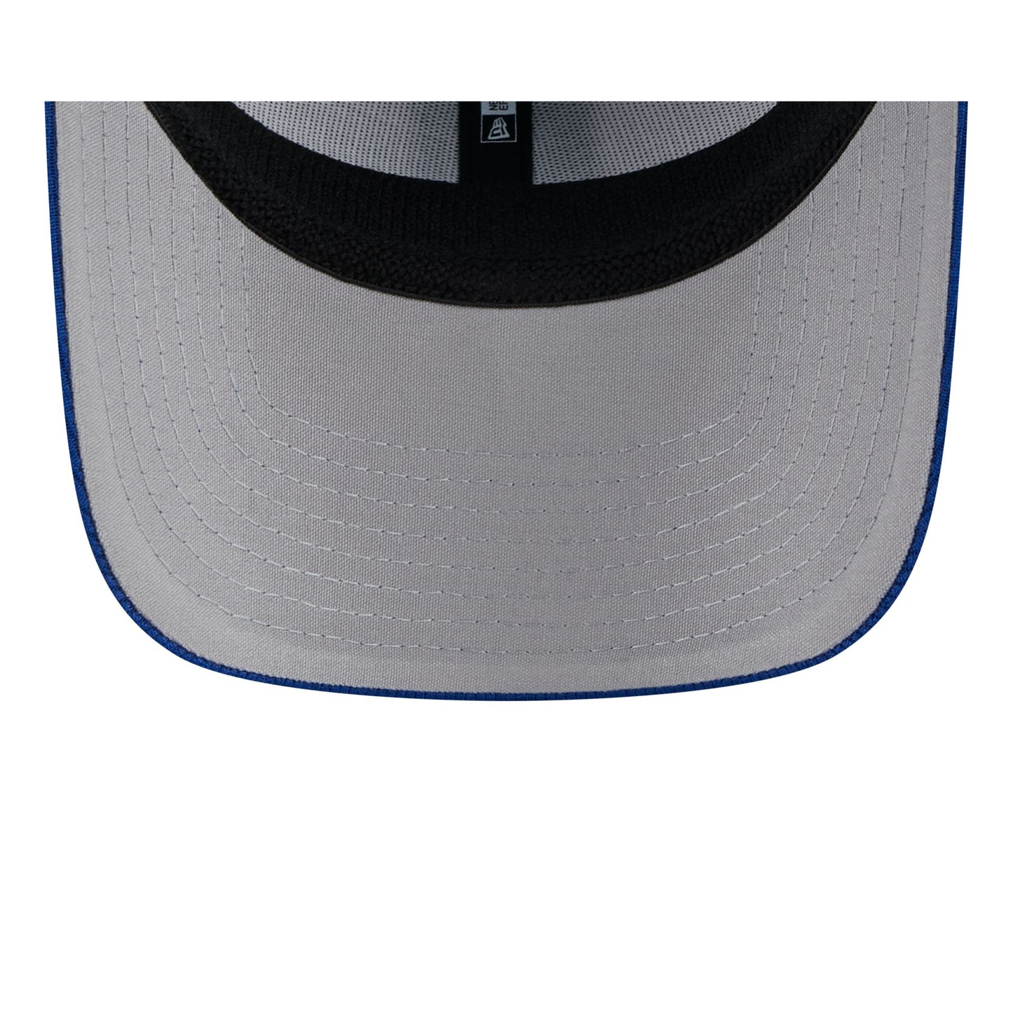 The Kansas City Royals 2025 Batting Practice 39THIRTY Stretch Fit Cap features an embroidered Royals logo at the front panels with a matching team wordmark at the rear. Additional details include a pivot knit fabrication, a blue visor, and a gray undervisor.