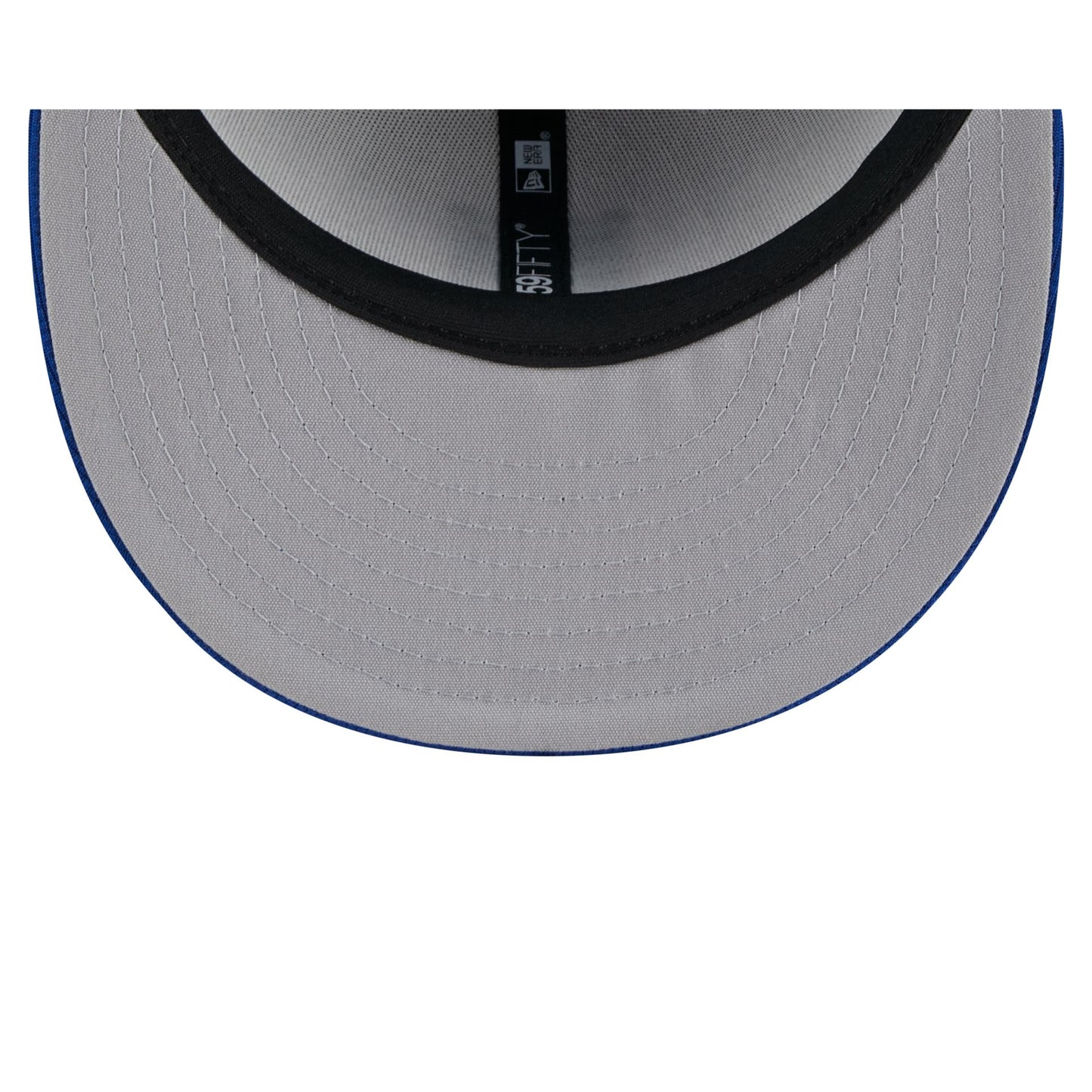 The Kansas City Royals 2025 Batting Practice 59FIFTY Fitted Cap features an embroidered Royals logo at the front panels with a matching MLB Batterman logo at the rear. Additional details include a pivot knit fabrication, a blue visor, and a gray undervisor.