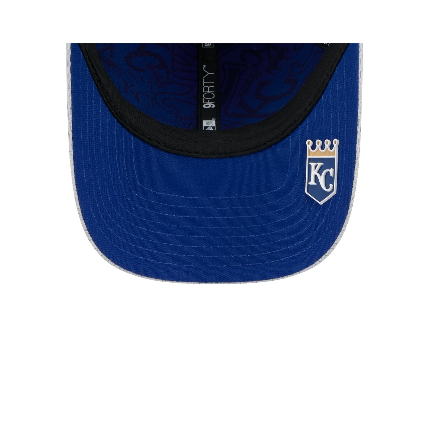 The Kansas City Royals 2025 Clubhouse Gray 9FORTY M-Crown Snapback features an embroidered Royals logo at the front panels with a matching MLB Batterman logo above a snapback closure at the rear and a dashmark mesh fabrication throughout. Additional details include a silicone team tag on the right-wear side and team logo on the undervisor.