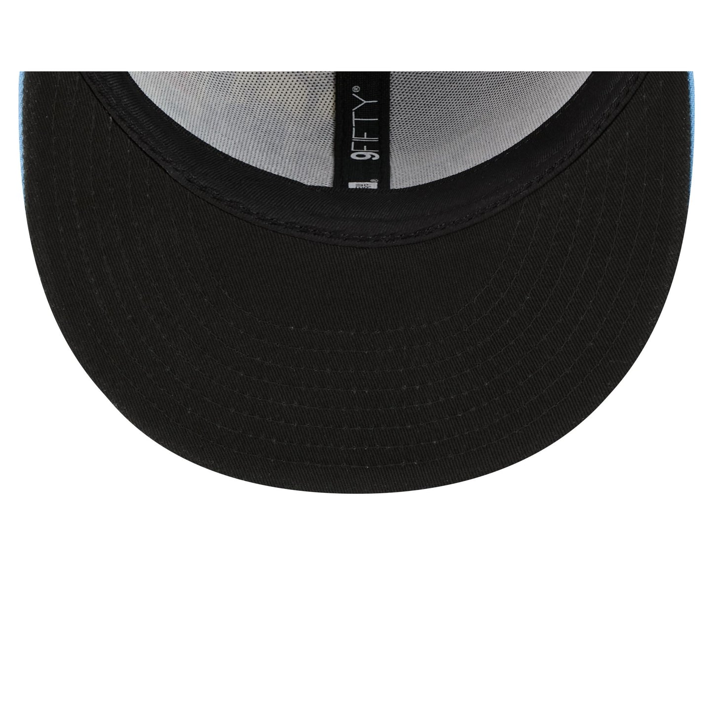 The Kansas City Royals Diamond Hero Edition 9FIFTY Snapback features an embroidered Royals onomatopoeia pop wordmark at the front panels with baseball comic book prints at the front and back panel. Additional details include a ZOOM! wordmark at the left-wear side, the MLB Batterman logo above a snapback closure at the rear, and a gray undervisor.