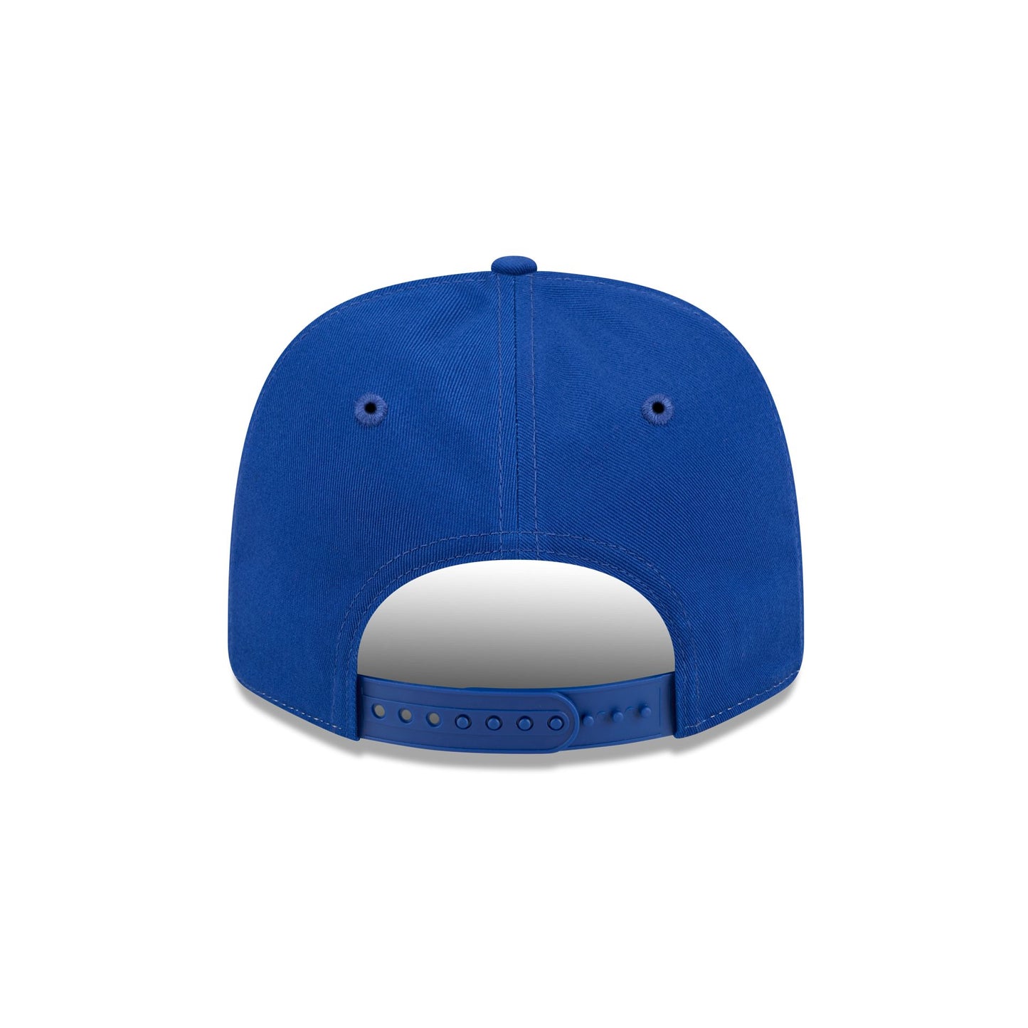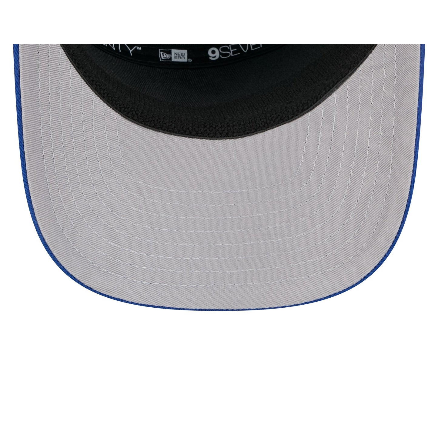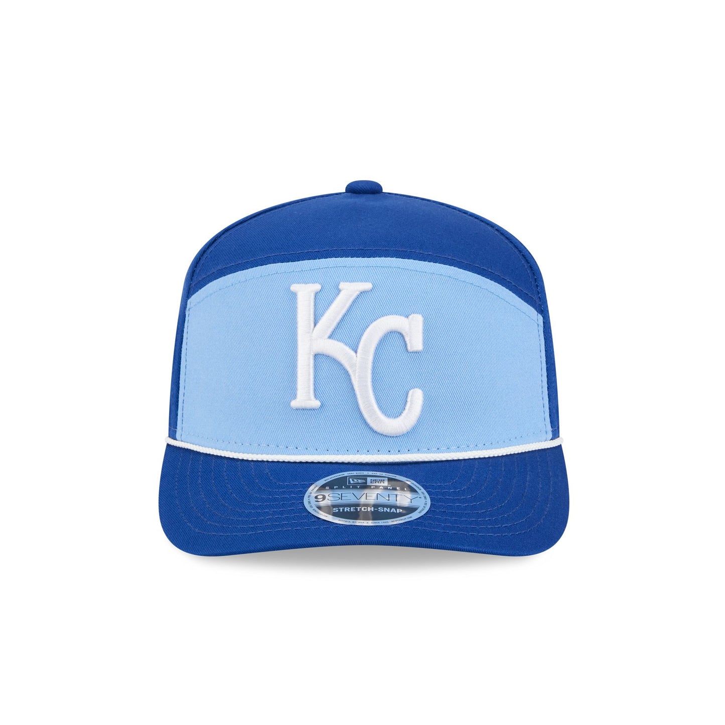 The Kansas City Royals Split Panel 9SEVENTY Stretch-Snap features an embroidered Royals logo at the front panel with a split crown construction and a rope at the visor. Additional details include an adjustable stretch-snap closure at the rear and a gray undervisor.
