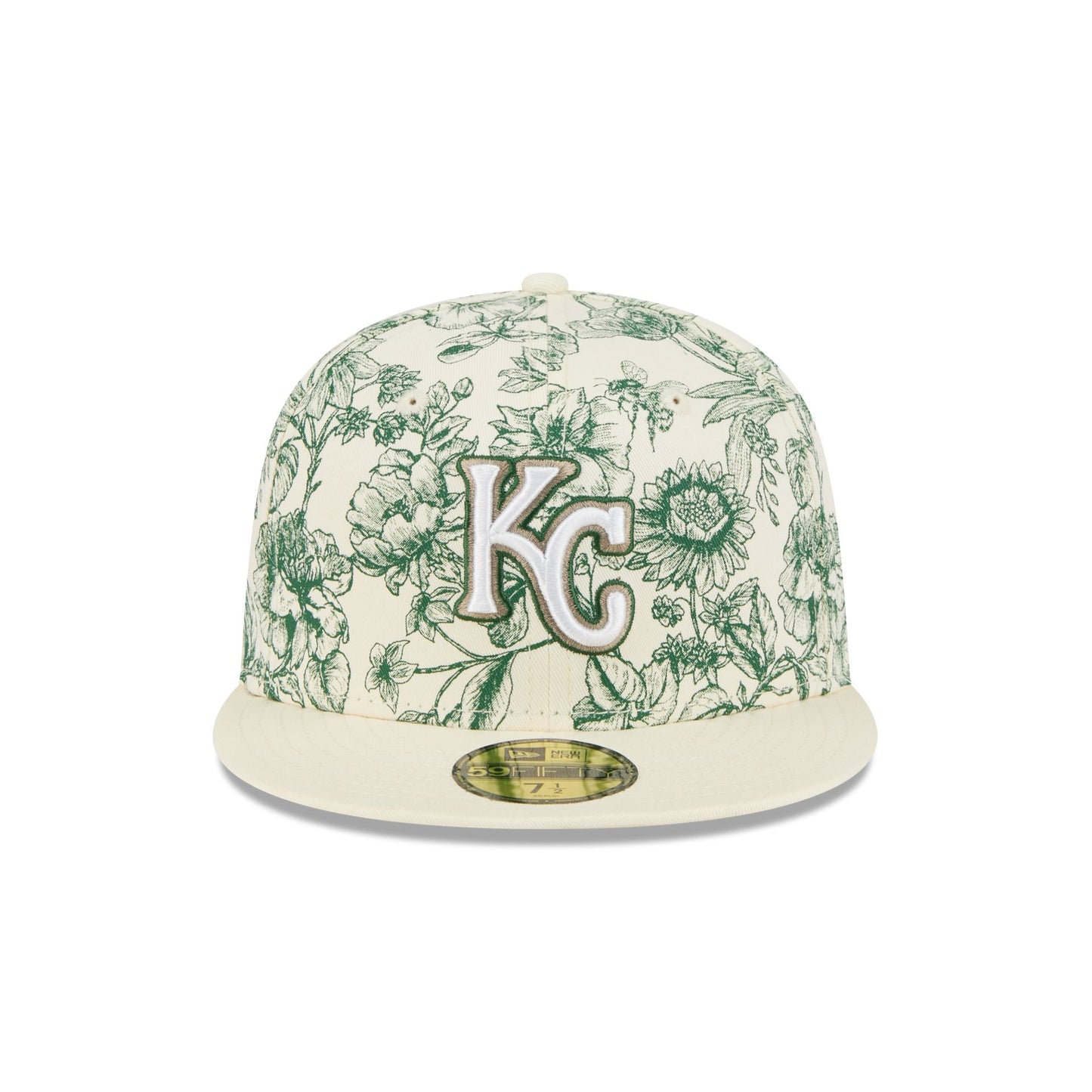 The Kansas City Royals Spring Floral 59FIFTY Fitted Cap features an embroidered Royals logo at the front panels with a matching MLB Batterman logo at the rear and a chrome visor. Additional details include a floral print cotton twill all over fabrication and a 2015 World Series patch at the right-wear side.