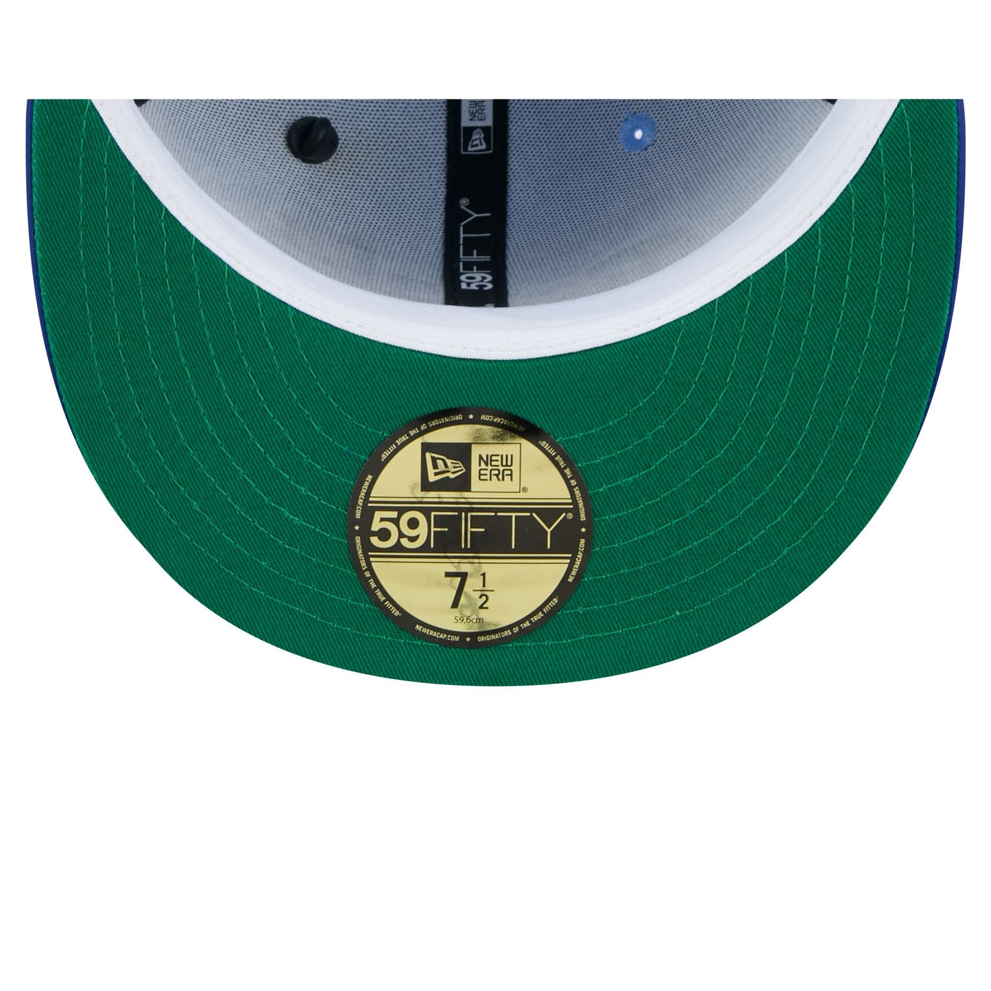 The Kansas City Royals Spring Satin 59FIFTY Fitted Cap features an embroidered Royals wordmark at the front panels with a New Era pin at the top left panel and an MLB Batterman logo at the rear. Additional details include a satin fabrication throughout, a logo at the right-wear side, and a green undervisor.