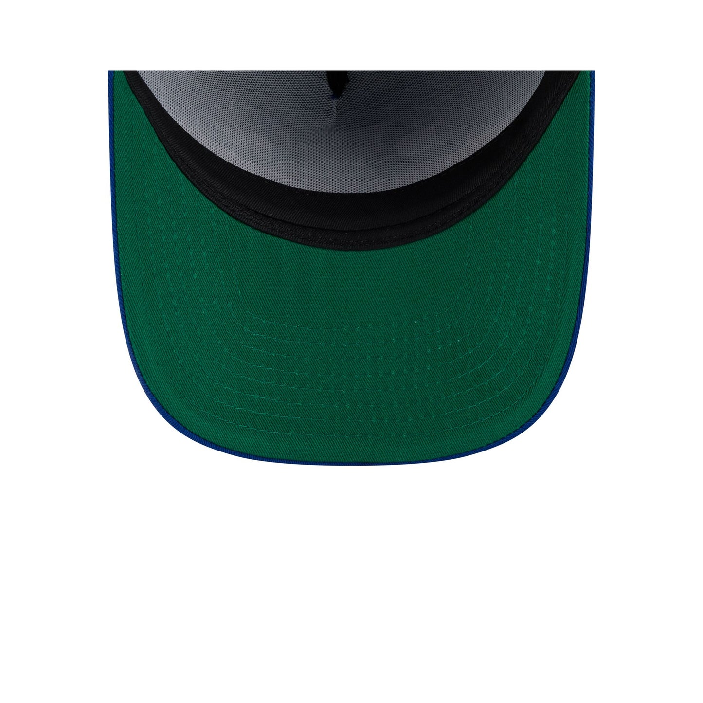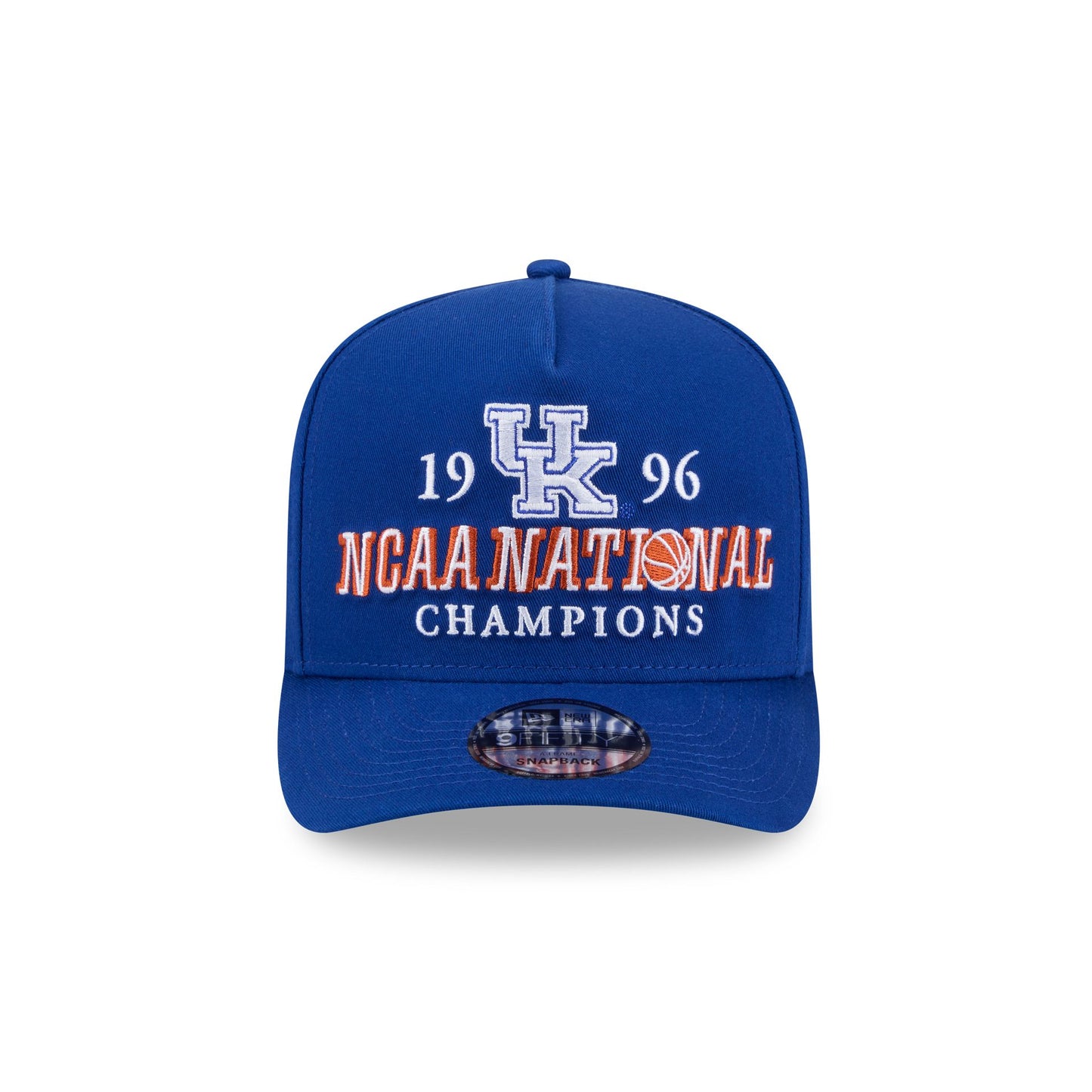 The Kentucky Wildcats Historic Win 9FIFTY A-Frame Snapback features an embroidered Wildcats graphic highlighting a historic victory at the front panels and a team logo at the right-wear side. Additional details include an adjustable snapback closure at the rear and a green undervisor.