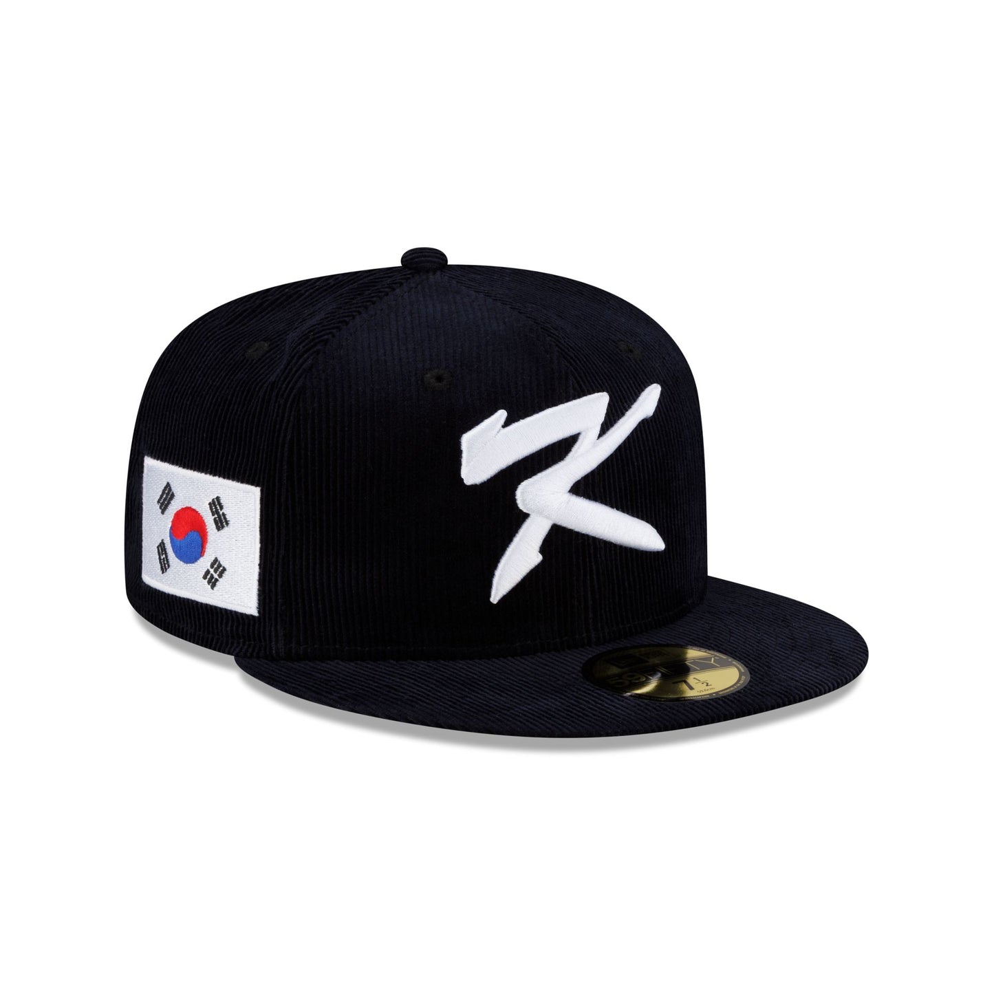 The Korea 2025 World Baseball Classic 59FIFTY Fitted Cap features an embroidered Korea logo at the front panels with their Flag at the right-wear side against a corduroy fabrication. Additional details include a World Baseball classic logo at the rear with a gray undervisor.