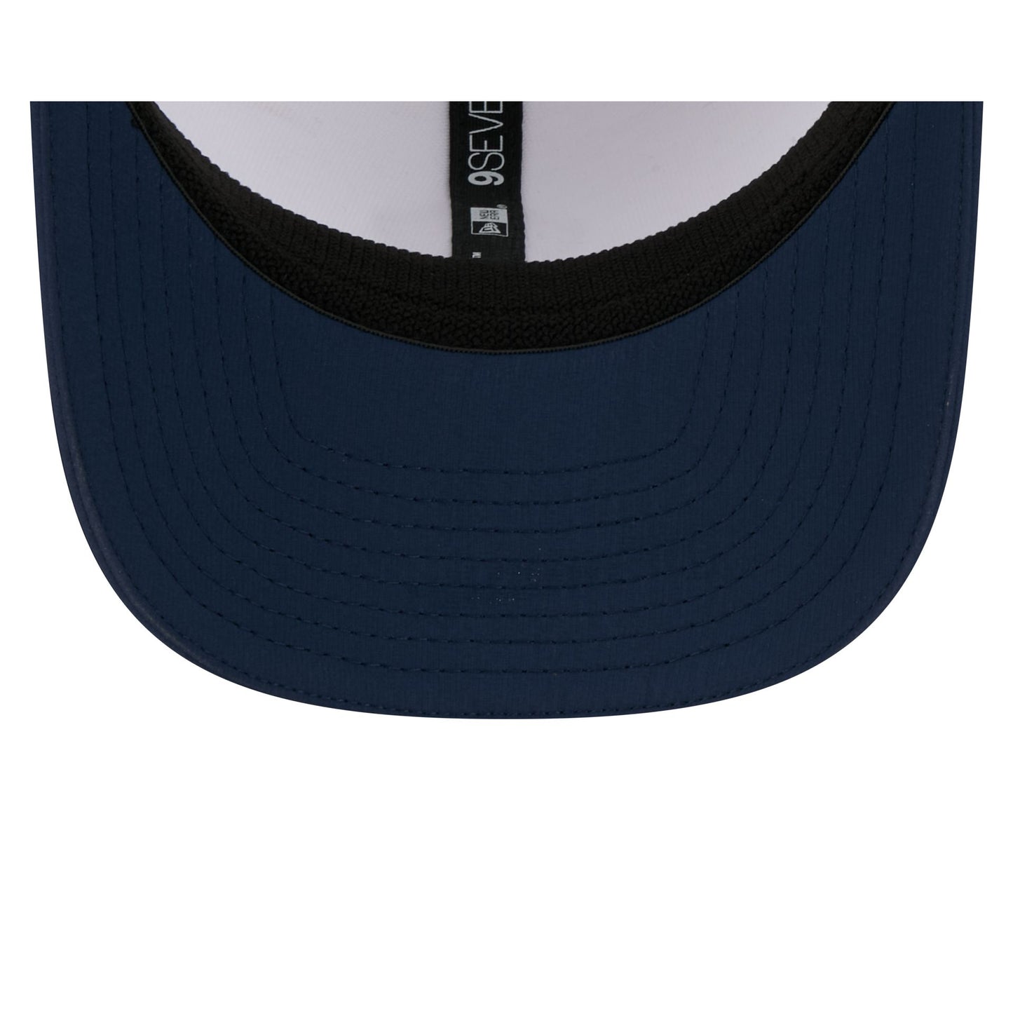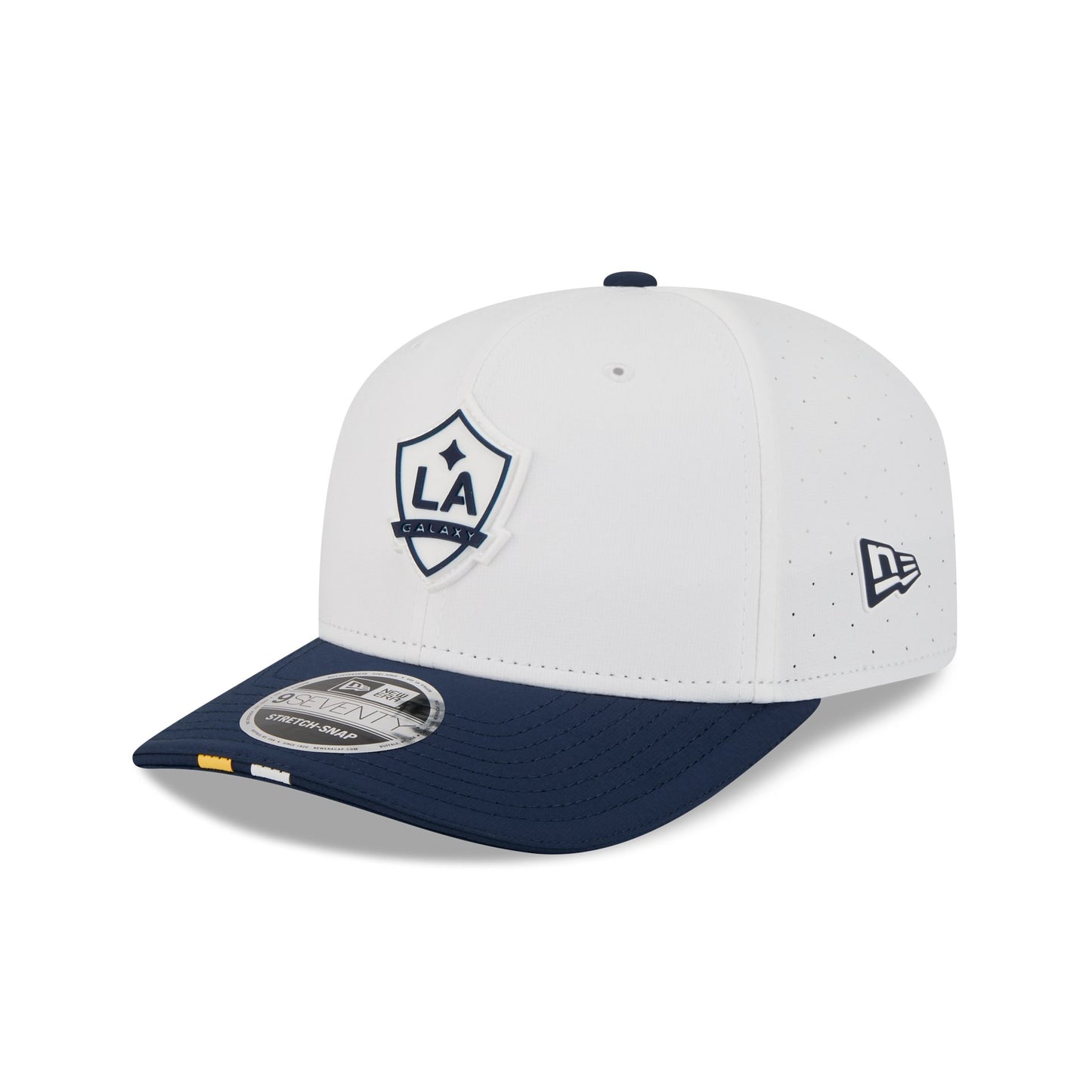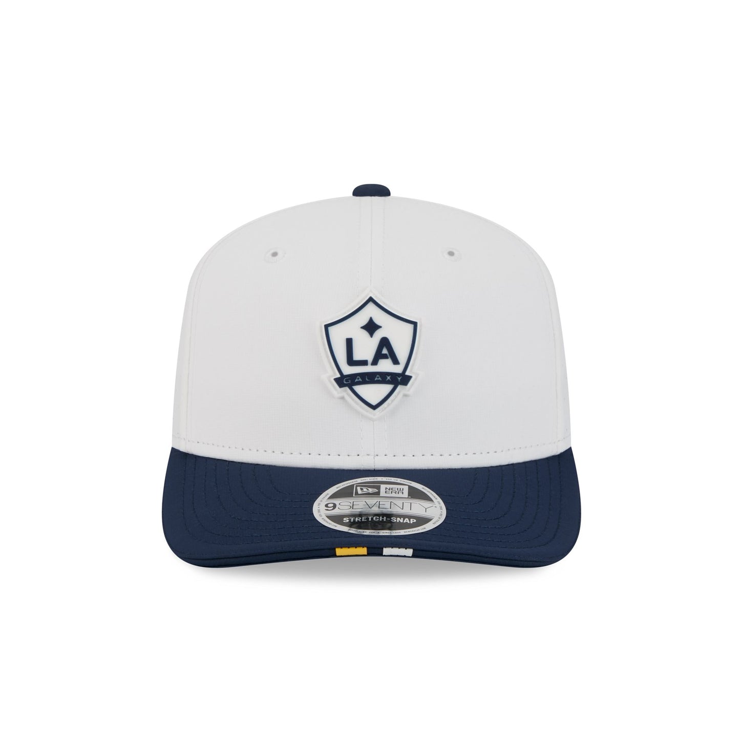 The LA Galaxy 2026 MLS Kickoff 9SEVENTY Stretch-Snap Cap features a stitch-down silicone Galaxy logo patch at the front panel with a matching woven MLS Shield tag above a stretch-snap closure at the rear. Additional details include a quill tech performance fabrication with a navy visor accented with team color stripes at the front.