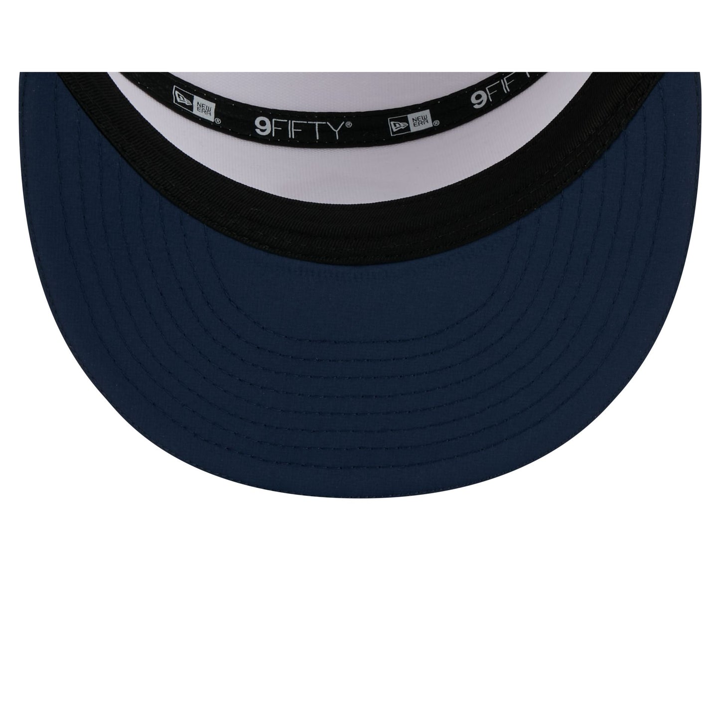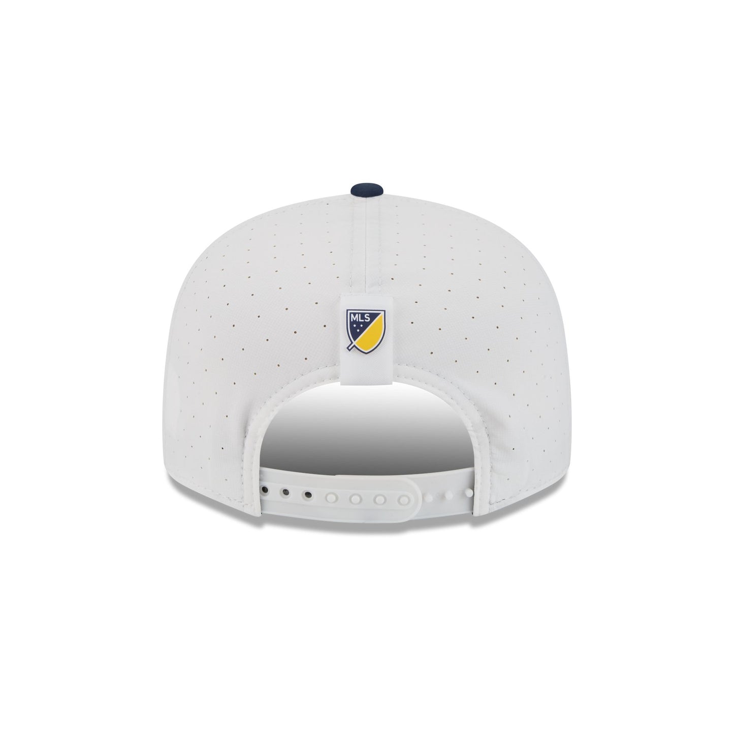The LA Galaxy 2026 MLS Kickoff Split Panel 9FIFTY Snapback features a stitch-down silicone Galaxy logo patch at the front panel with a matching woven MLS Shield tag above a snapback closure at the rear. Additional details include a quill tech performance fabrication with a navy visor accented with team color stripes at the front.
