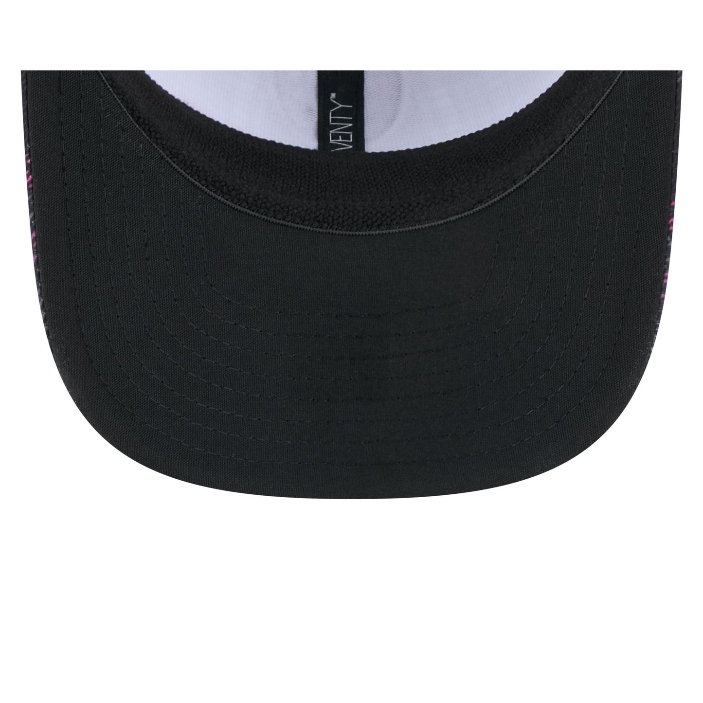 The Las Vegas Raiders 2024 Crucial Catch 9SEVENTY Trucker features an embroidered Raiders logo at the front panels with a Crucial Catch Intercept Cancer patch at the right-wear side. Additional details include a mesh back with an NFL Shield above a snapback closure at the rear and a gray undervisor.