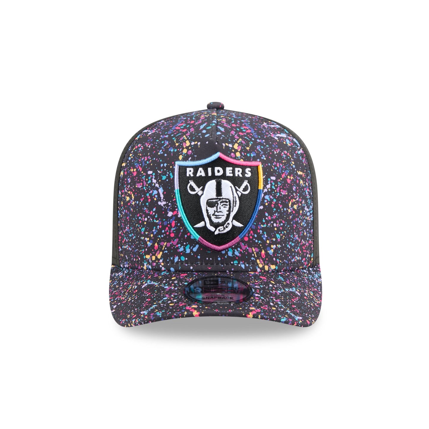The Las Vegas Raiders 2025 Crucial Catch 9FIFTY A-Frame Snapback features an embroidered Raiders logo at the front paint splatter panels with a woven NFL Shield tag above a snapback closure at the rear. Additional details include a Crucial Catch Intercept Cancer patch at the right-wear side and a black undervisor.