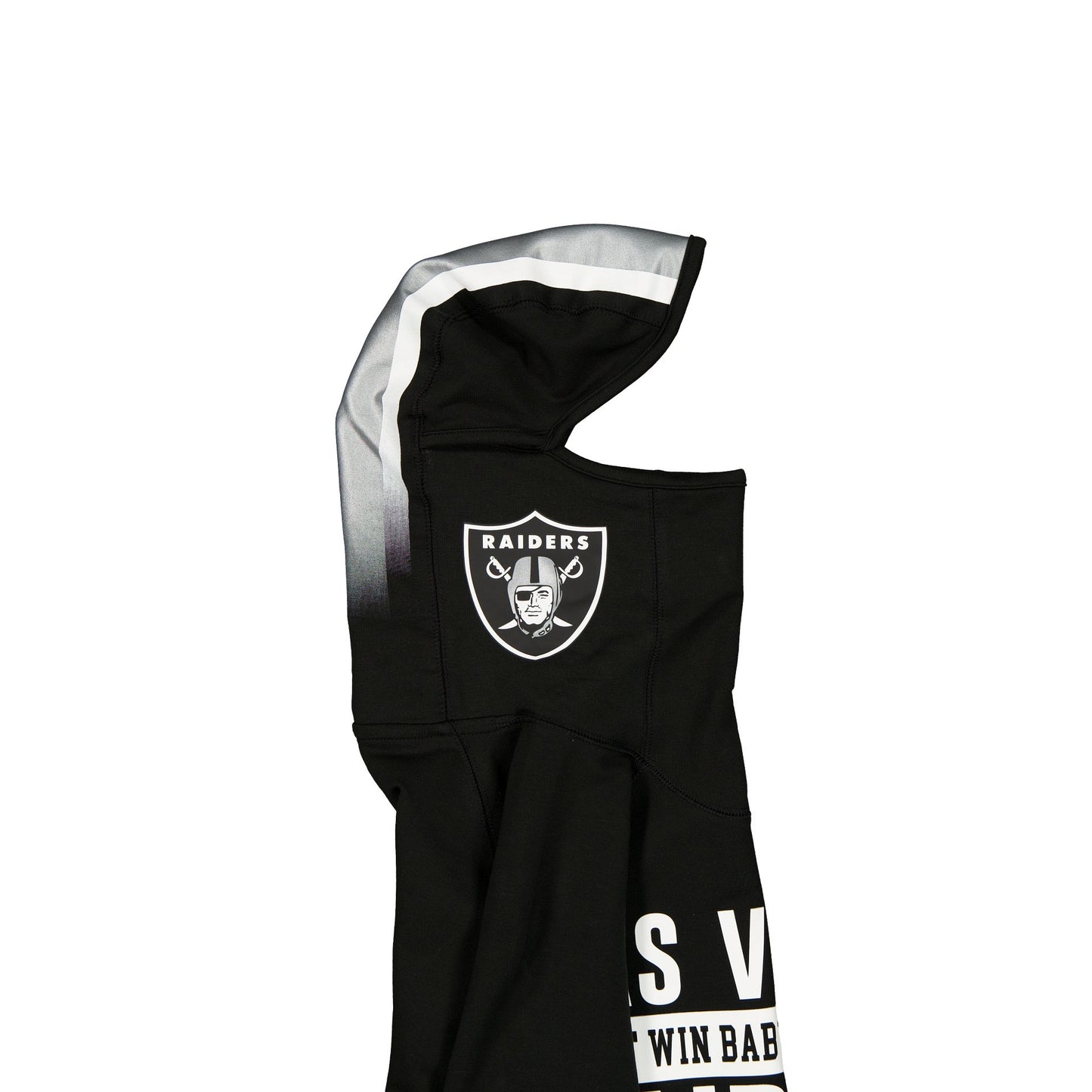 The Las Vegas Raiders 2025 Functional Fandom Black Balaclava Hoodie features a screen-printed Raiders graphic at the chest with a matching logo and helmet stripe at the hood and an Official NFL Combine Authentic patch at the left hip. Additional details include moisture-wicking and antimicrobial fabric.