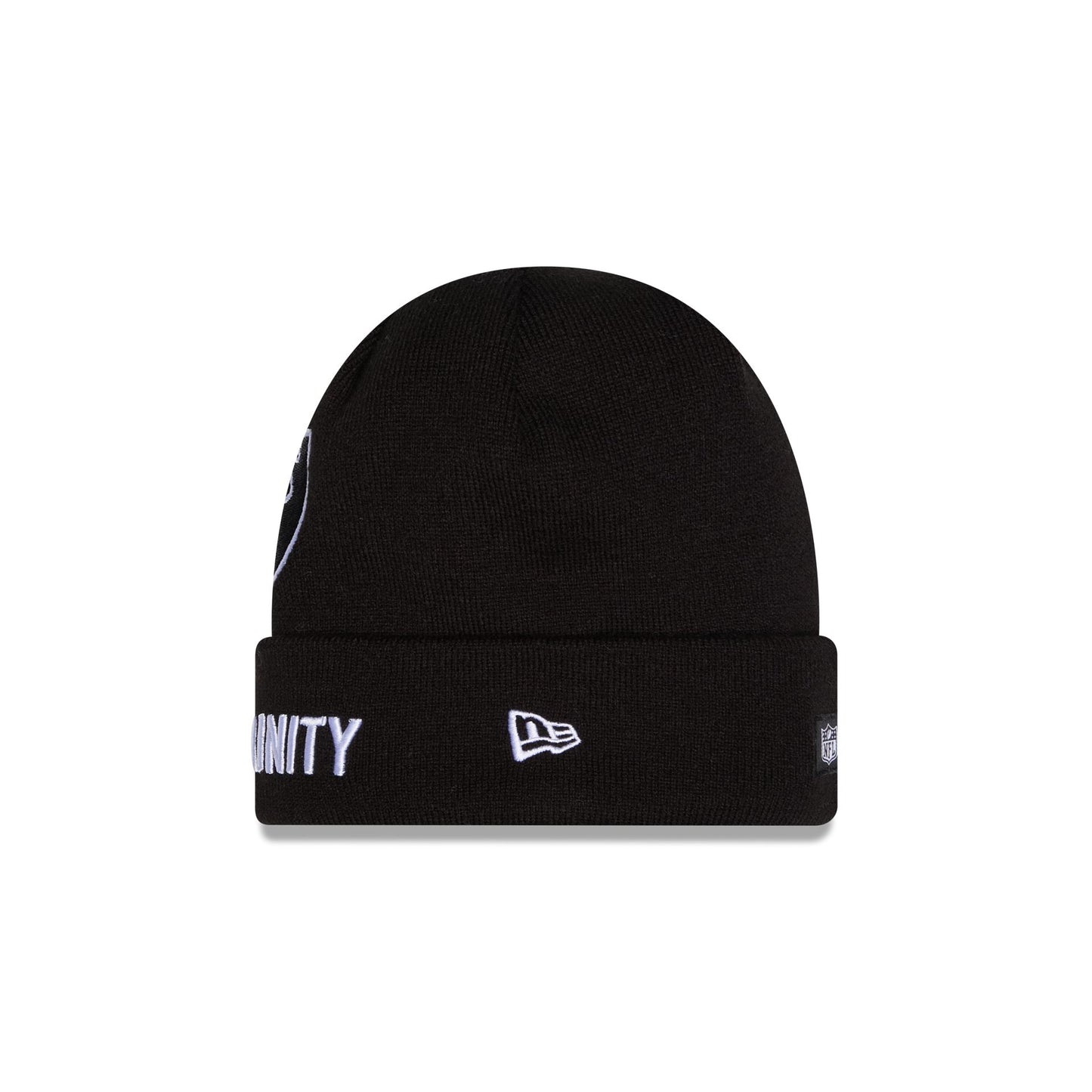 The Las Vegas Raiders 2025 Inspire Change Beanie features an embroidered Raiders logo at the front crown and matching "Opportunity" wordmark at the front cuff with an NFL Inspire Change patch at the rear.