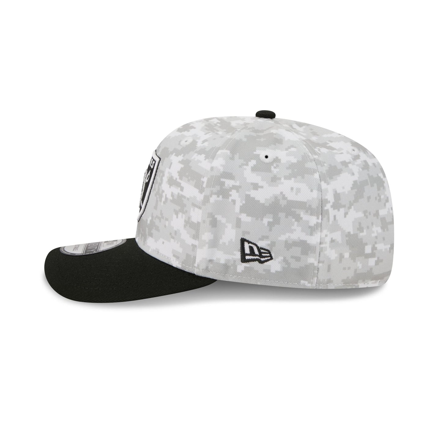 The Las Vegas Raiders 2025 Salute to Service Fan Gear 9SEVENTY Stretch-Snap Cap features an embroidered Raiders logo at the front panels with the official NFL Salute to Service patch above a snapback closure at the rear, an American flag patch at the right-wear side, and a team color visor.