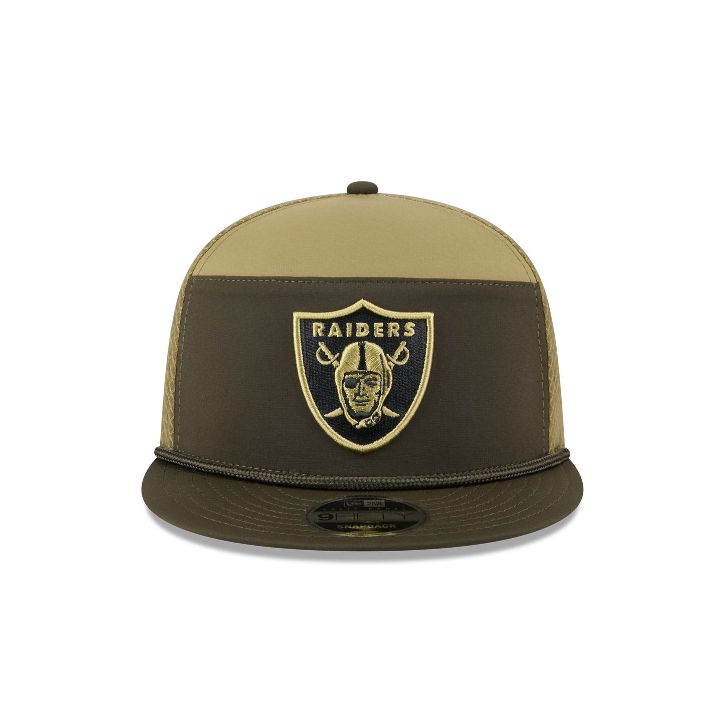 The Las Vegas Raiders 2025 Salute to Service Split Panel 9FIFTY Trucker features an embroidered Raiders logo at the front panels with the official NFL Salute to Service patch above a snapback closure at the rear. Additional details include an American flag patch at the right-wear side with a silicone team logo patch at a dark green undervisor and a digi camo interior fabrication.