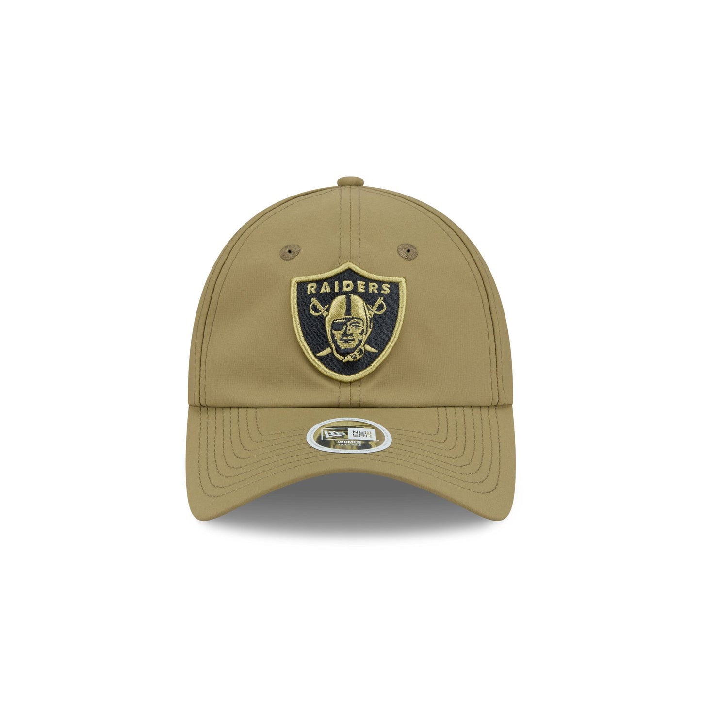 The Las Vegas Raiders 2025 Salute to Service Women's Open Back Ponytail Cap features an embroidered Raiders logo at the front panels with the official NFL Salute to Service patch at the right-wear side, a digi camo interior fabrication, and a dark green undervisor. Additional details include an adjustable strap and open panel at the rear to accommodate any hairstyle.