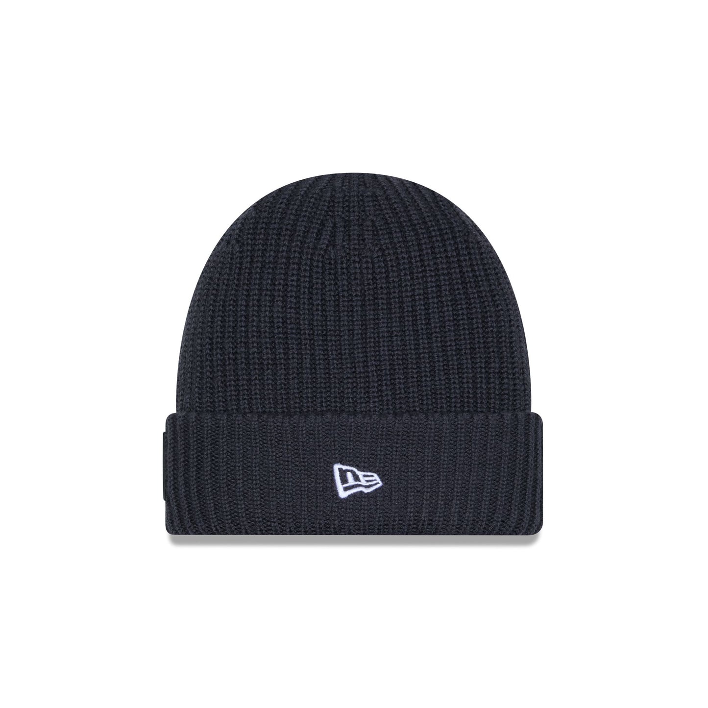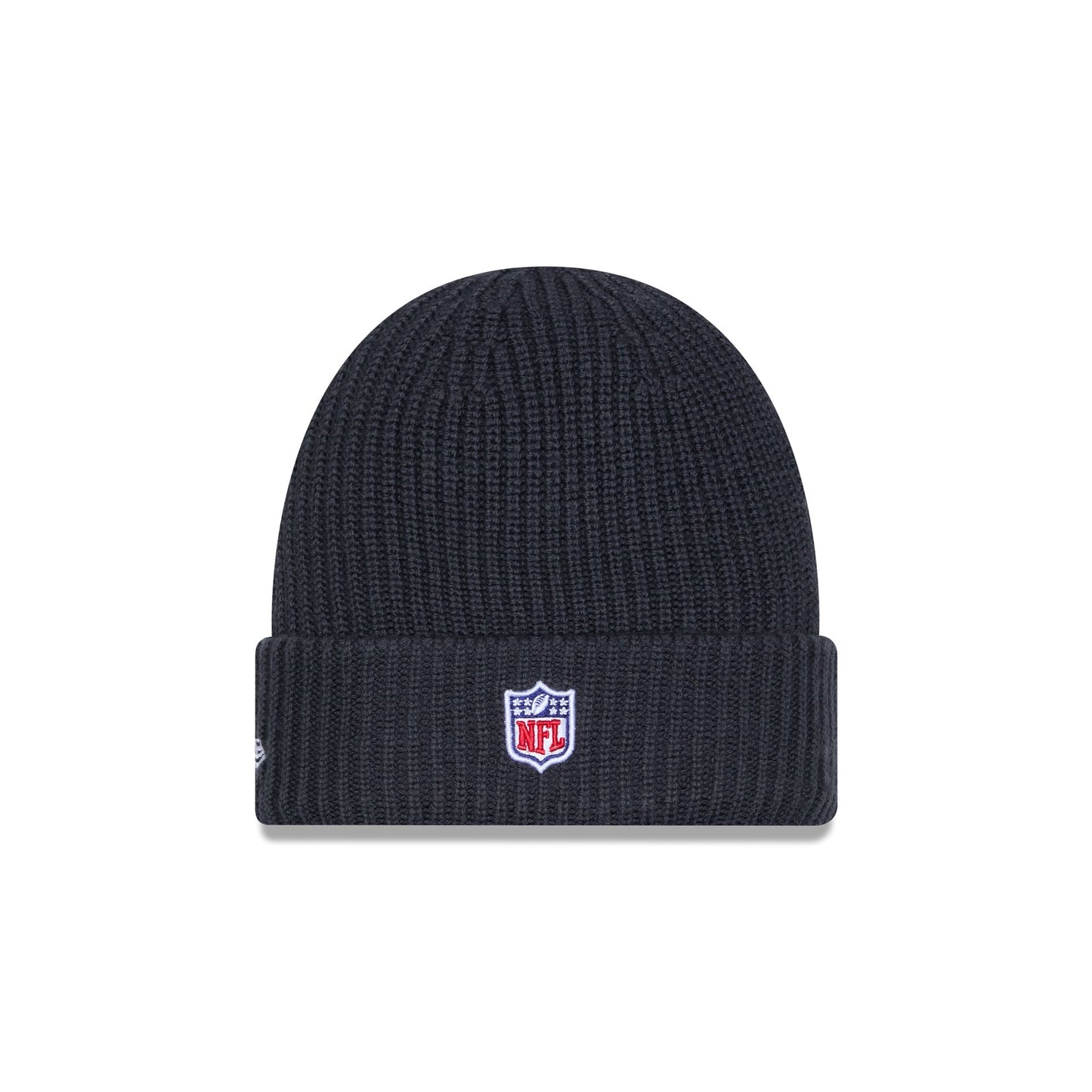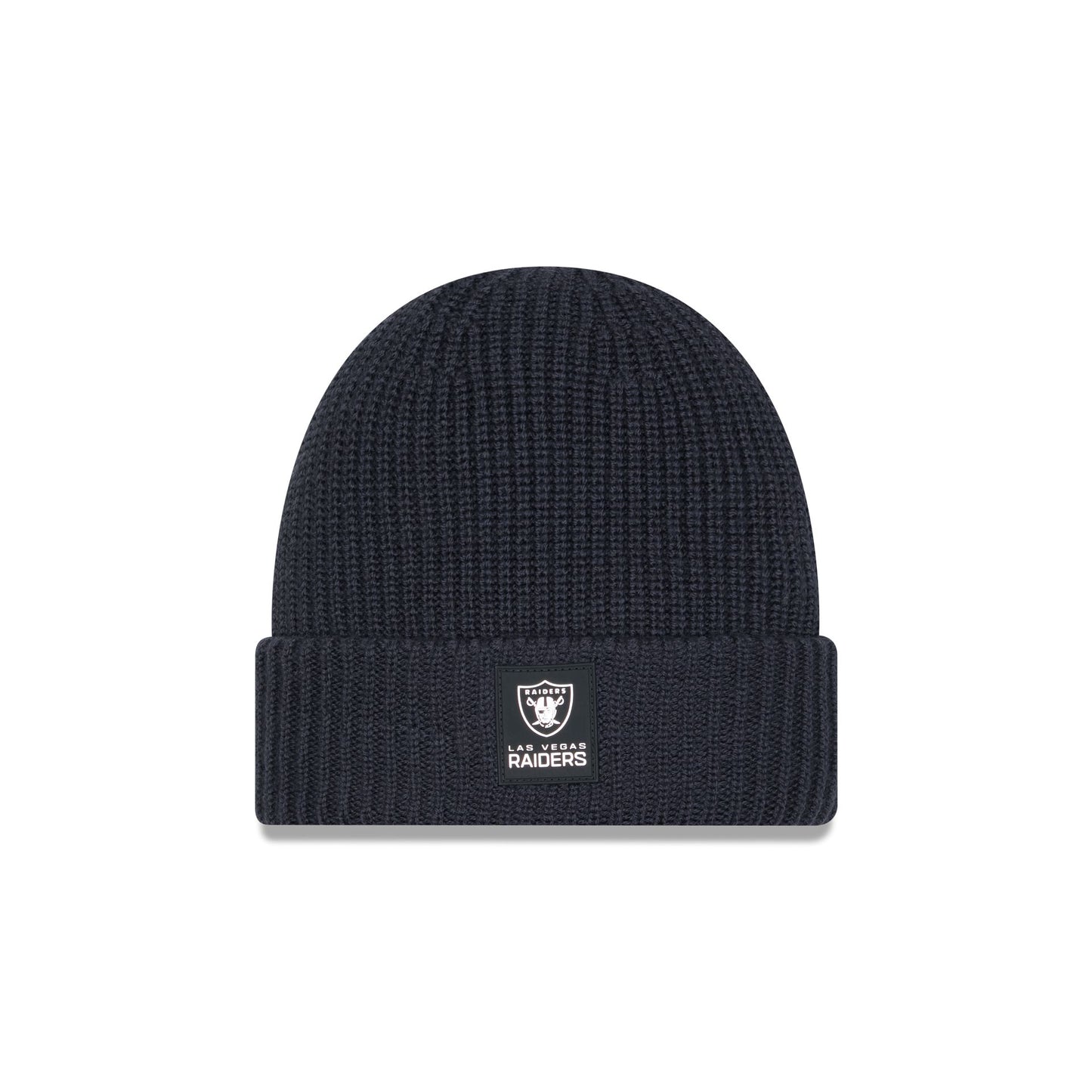 The Las Vegas Raiders 2025 Sideline Cold Weather Steel Clouds Cuff Knit Beanie features a sewn-down silicone Raiders logo patch at the front cuff with a matching Official NFL Shield logo at the rear. The beanie is knit from wool yarn and lined with fleece.
