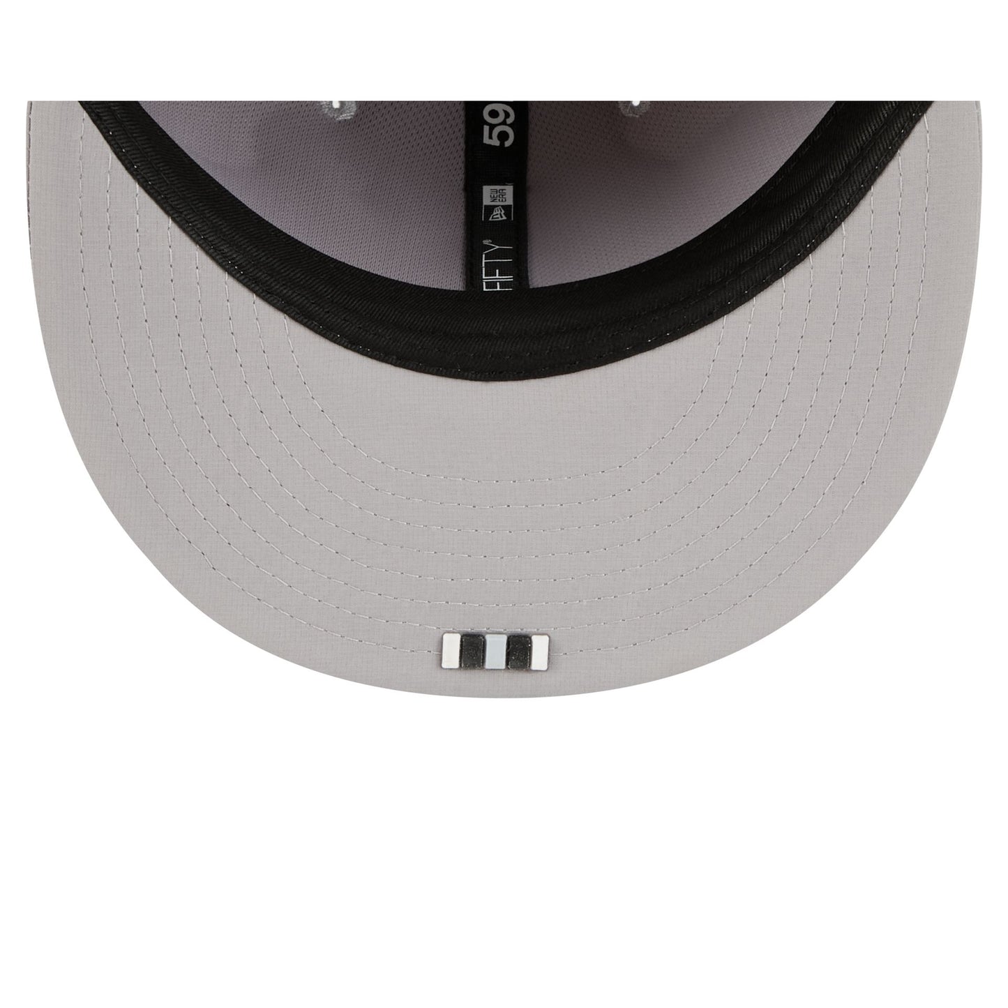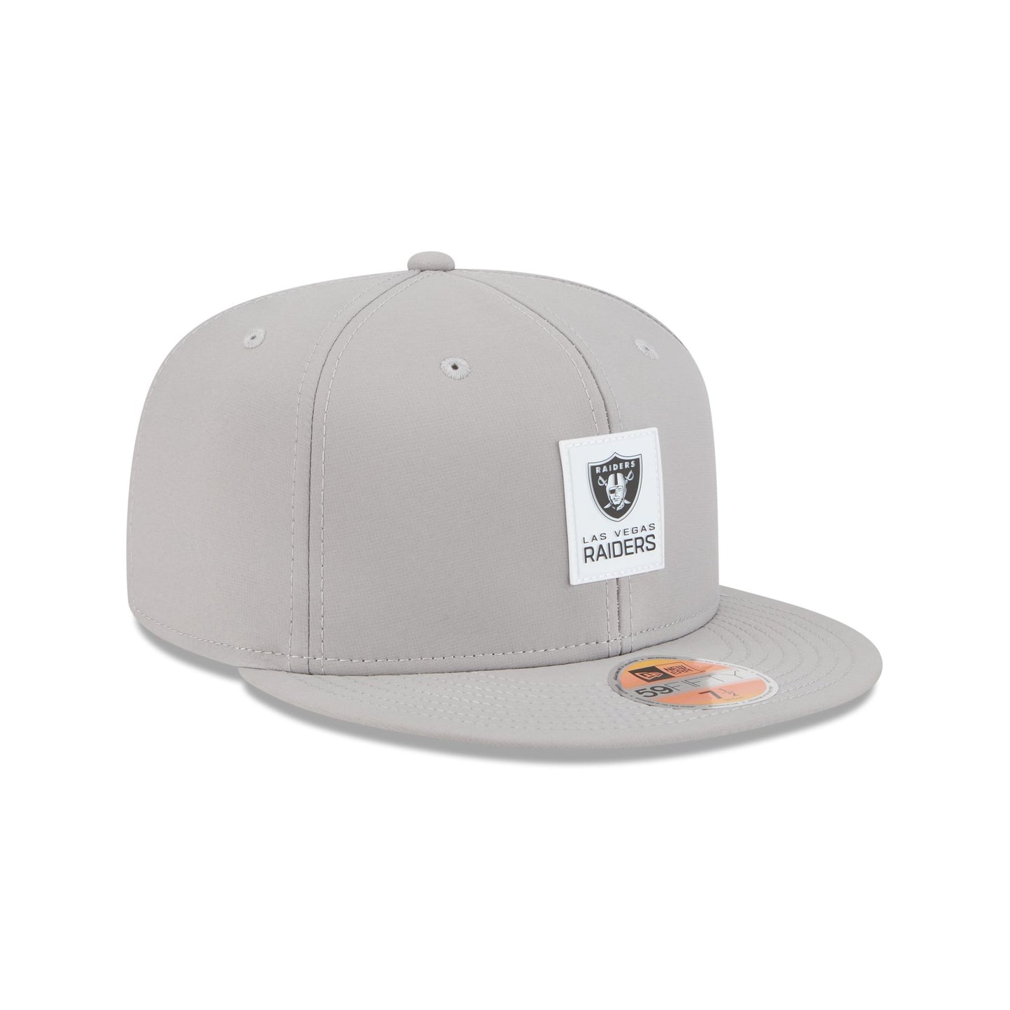 The Las Vegas Raiders 2025 Sideline Hot Weather Gray 59FIFTY Fitted Cap features a sewn-down silicone Raiders logo patch at the front panels with a matching Official NFL Shield logo at the rear. The cap has a water-repellent quill tech fabrication throughout, with a quick-dry cushioned sweatband to absorb moisture. The undervisor is accented with a silicone transfer in the team’s colors.