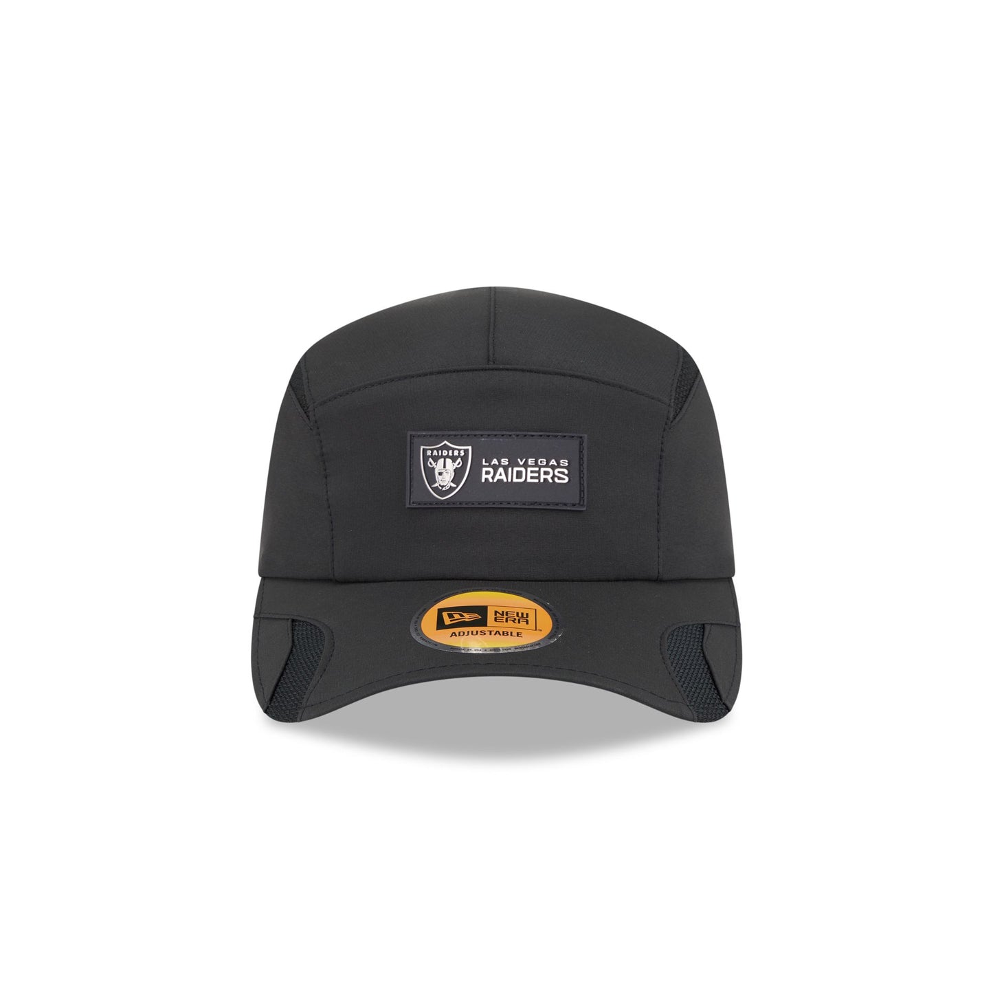 The Las Vegas Raiders 2025 Sideline Hot Weather Runner Adjustable Cap features a sewn-down silicone Raiders logo patch at the front panels with a water-repellent quill tech fabrication throughout and a quick-dry cushioned sweatband to absorb moisture. Additional details include the Official NFL Shield logo to the right of an adjustable hook-and-loop closure at the rear and mesh accents at the visor sides and side crown panels. The closure is accented with mesh a silicone transfer in the team’s colors.