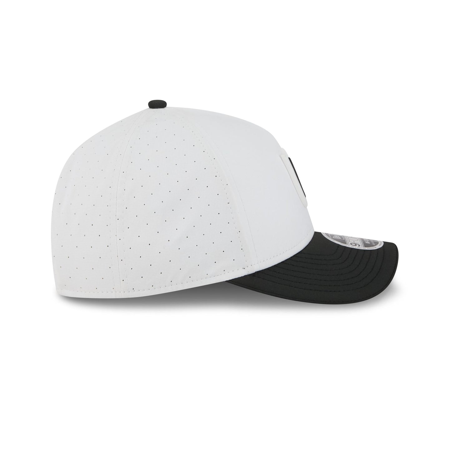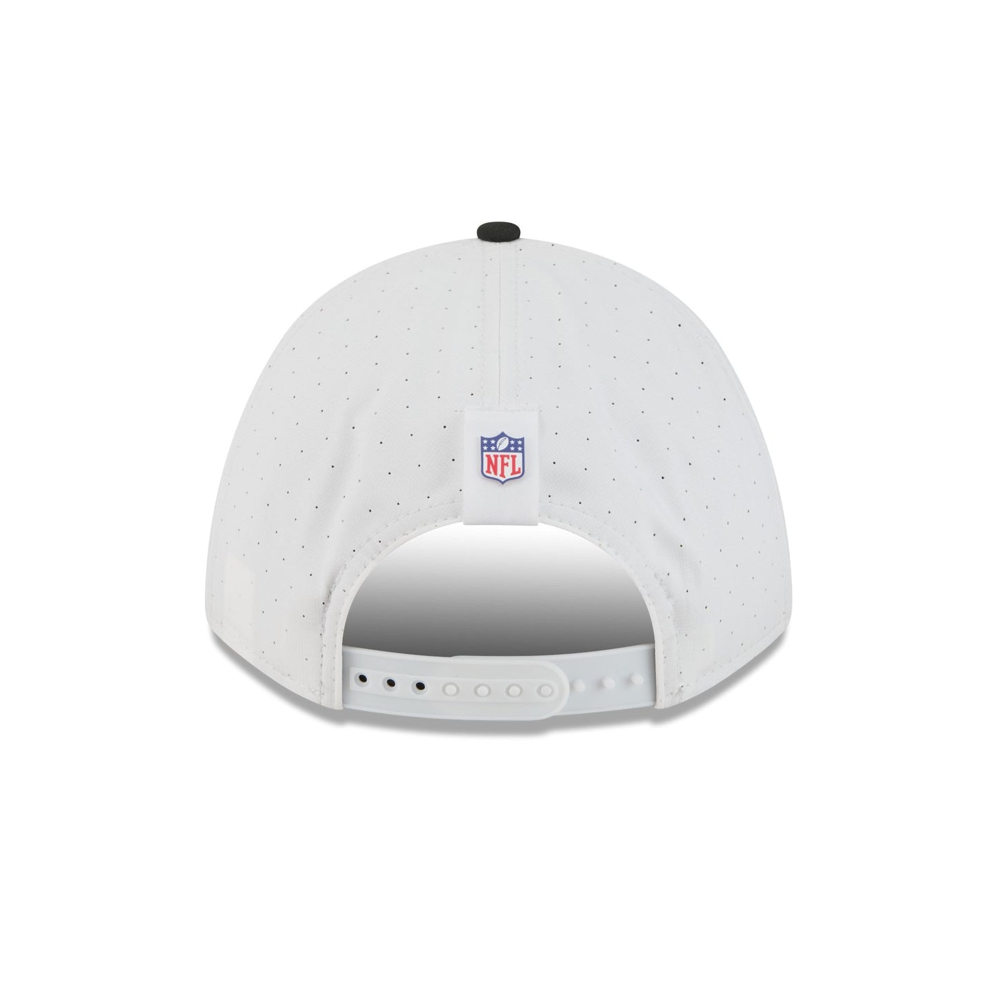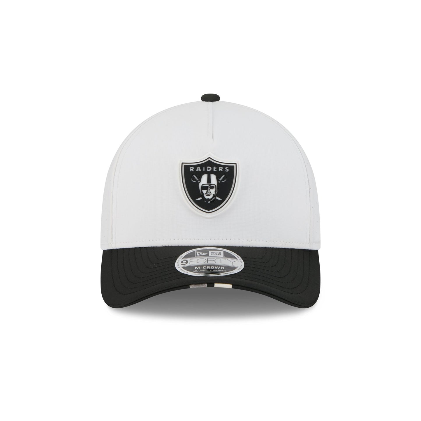 The Las Vegas Raiders 2025 Training 9FORTY M-Crown A-Frame Snapback features a silicone Raiders patch at the front panel with team color stripes at the front of a black visor. Additional details include a silicone NFL Shield patch on a woven foldover tab above a snapback closure at the rear.