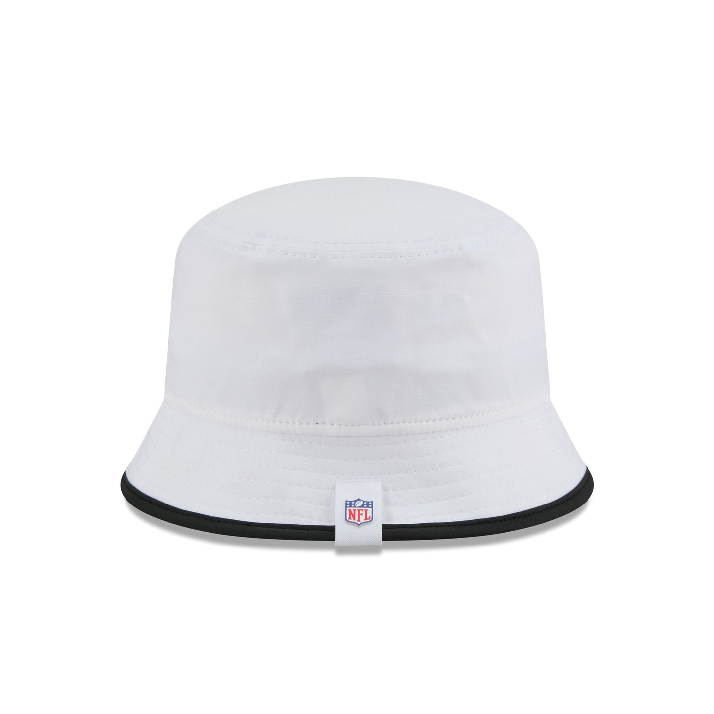 The Las Vegas Raiders 2025 Training Bucket Hat features a silicone Raiders patch at the front panel with team color piping along the edge and a silicone NFL Shield patch on a woven foldover tab at the rear.