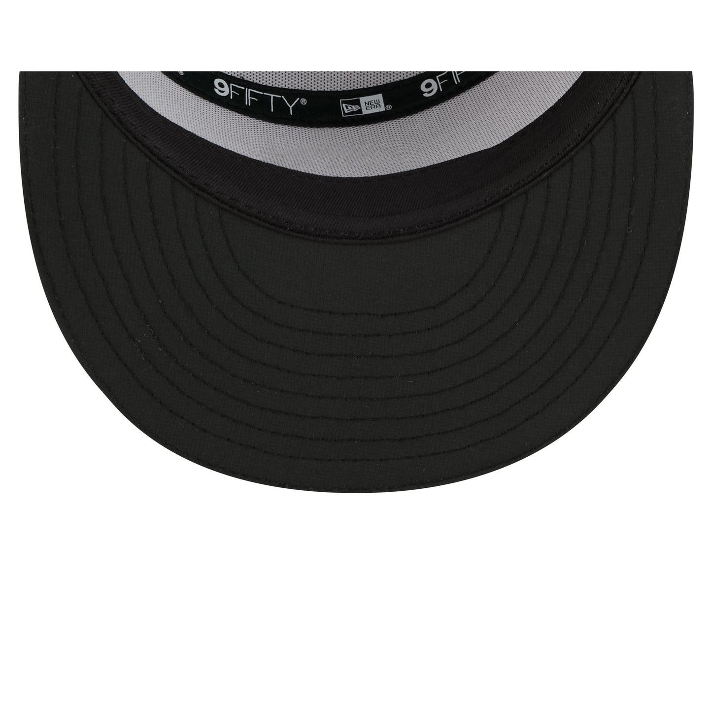 The Las Vegas Raiders 2025 Training Split Panel 9FIFTY Snapback features a silicone Raiders patch at the front panel with team color stripes at the front of a black visor. Additional details include a silicone NFL Shield patch on a woven foldover tab above a snapback closure at the rear.