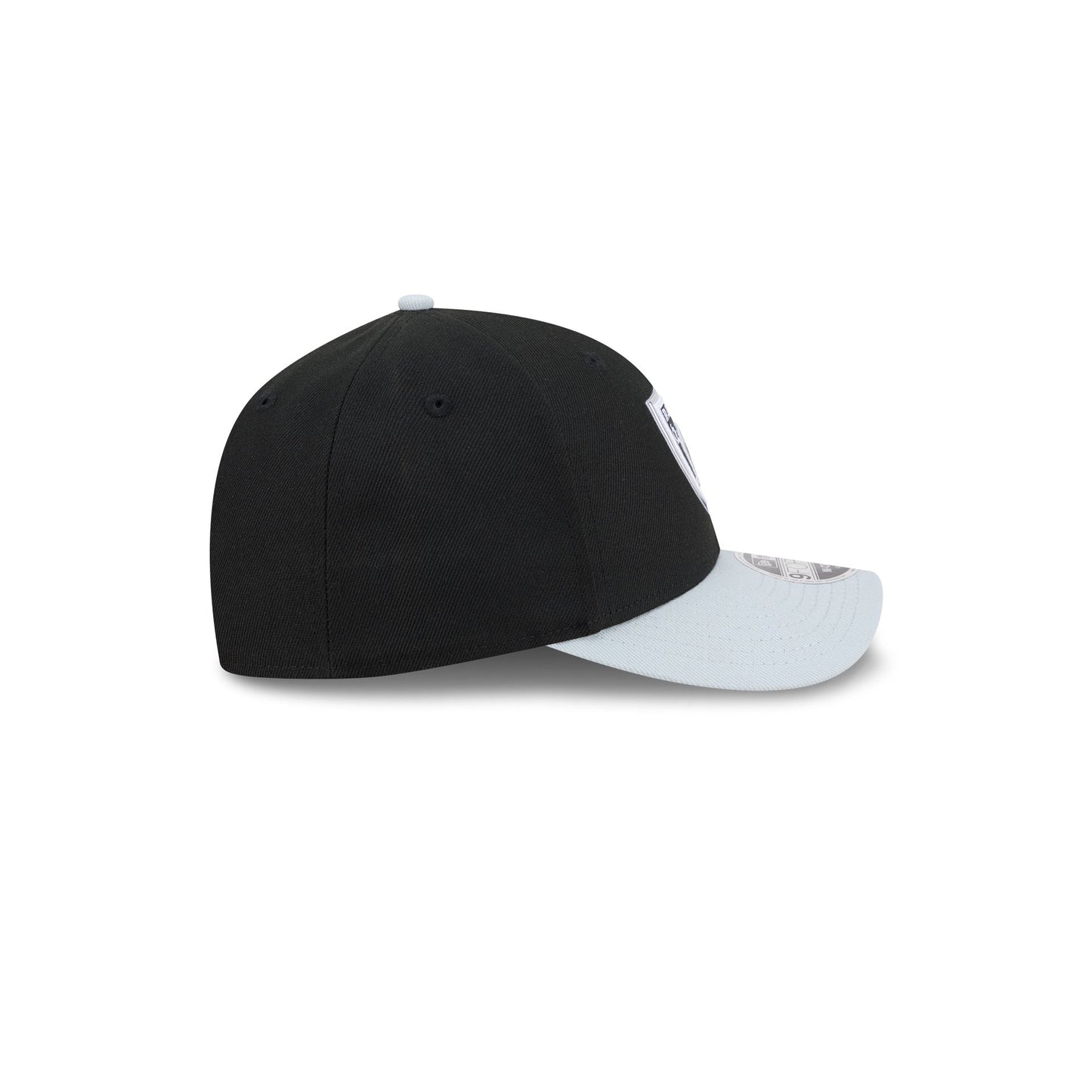 The Las Vegas Raiders 2026 Draft Kids 9FORTY M-Crown Snapback features a heat sealed liquid chrome Raiders patch and an Official 2026 NFL Draft pin at the front panels with an NFL Shield above a team wordmark on a snapback closure at the rear. Additional details include a city inspired interior fabrication with a Once a Raider, Always a Raider wordmark at the rear tape, a chrome New Era Flag at the left-wear side, and a gray visor.