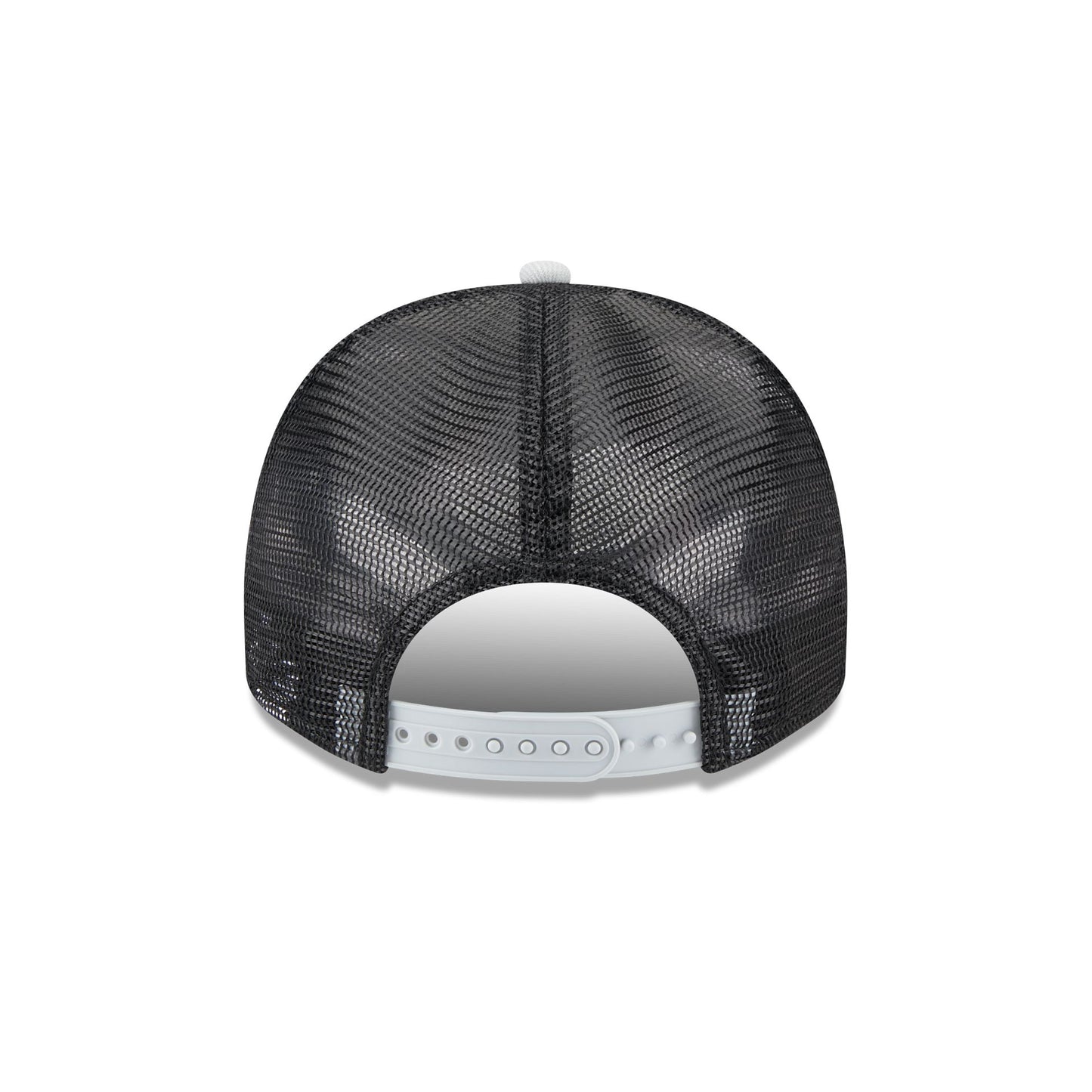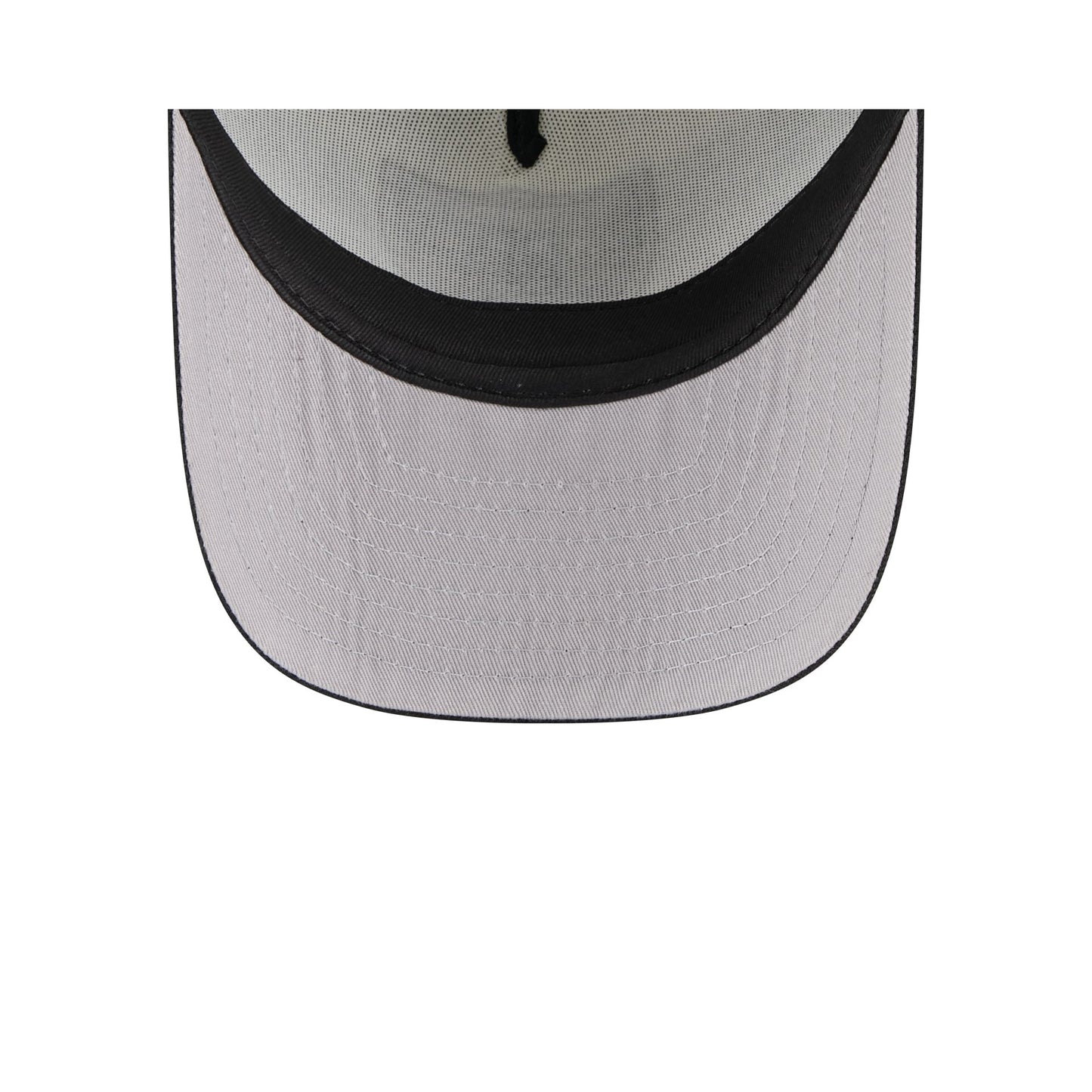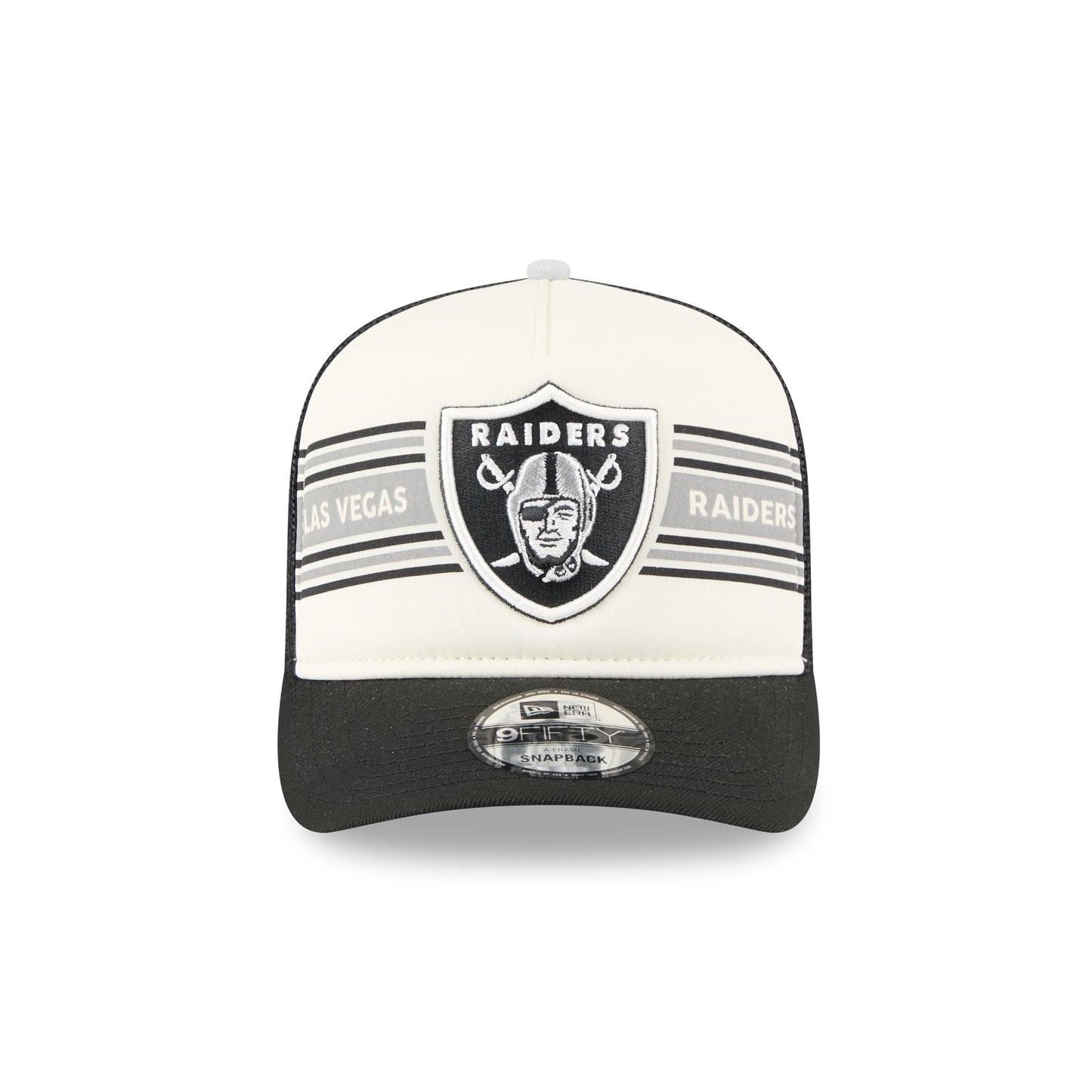 The Las Vegas Raiders Banner 9FIFTY A-Frame Trucker features a embroidered Raiders logo at the front panels against a screen-printed stripe at the front panels. Additional details include a snapback closure at a mesh rear and a gray undervisor.