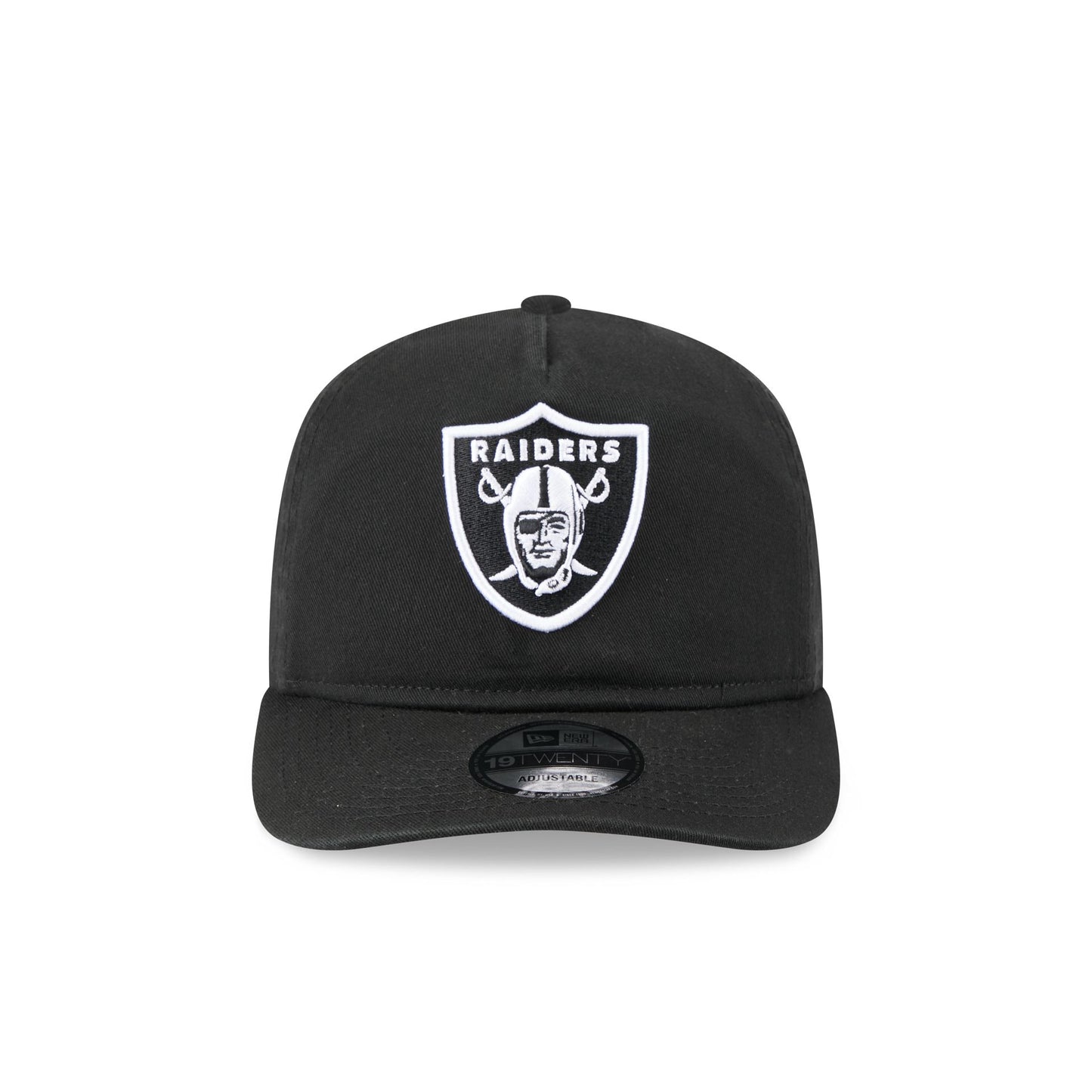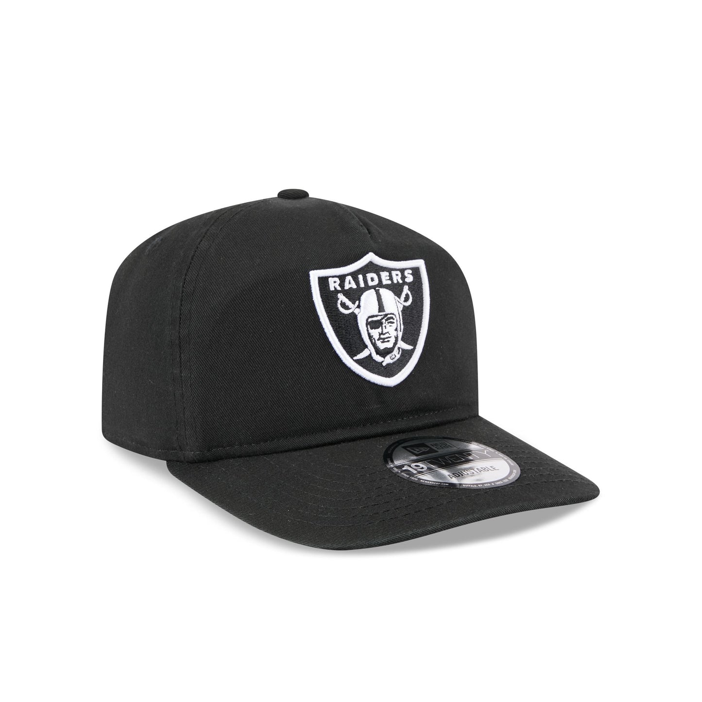 The Las Vegas Raiders Black and White 19TWENTY Snapback features an embroidered Raiders logo at the front with a snapback closure at the rear and a gray undervisor.