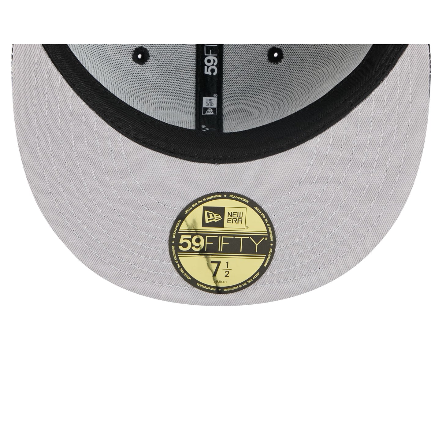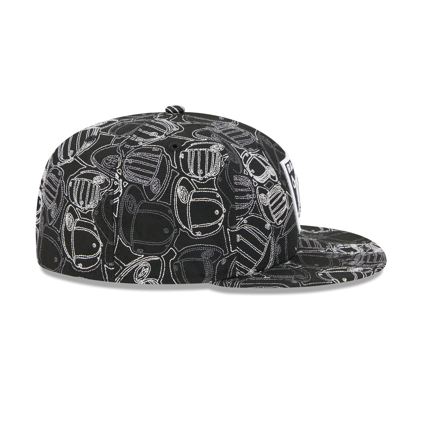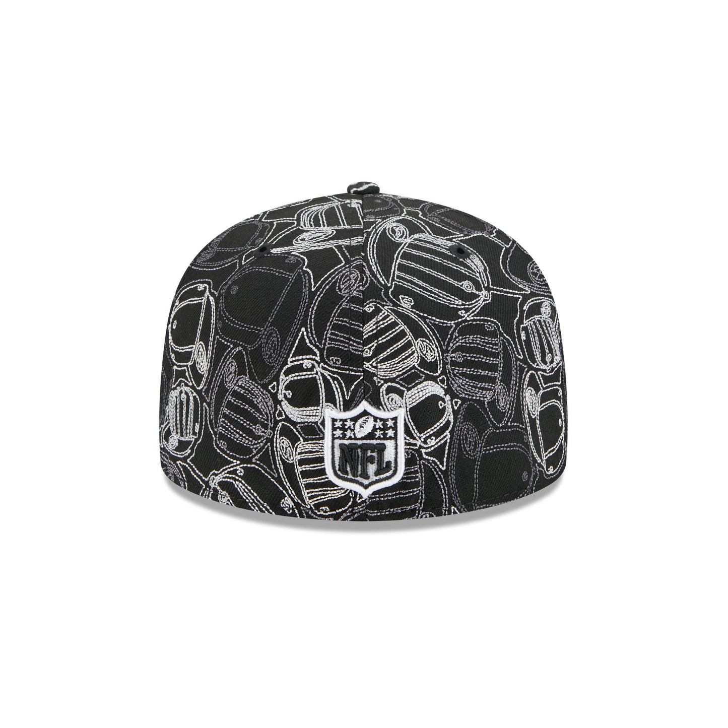 The Las Vegas Raiders Cap Scramble 59FIFTY Fitted Cap features an embroidered Raiders logo at the front panels with chainstitched allover cap patterned fabrication, an NFL Shield at the rear, and a gray undervisor.