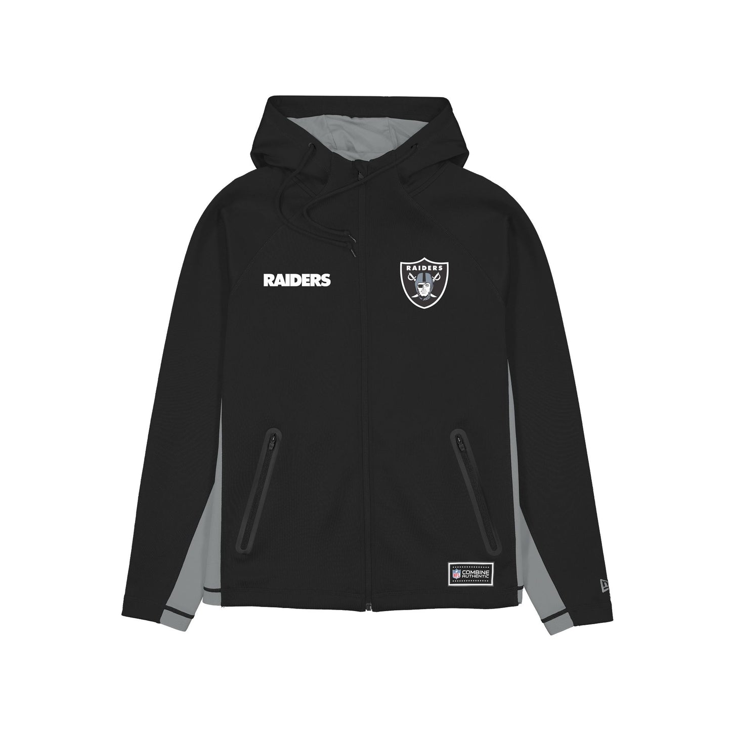 The Las Vegas Raiders Combine Full-Zip Hoodie features a screen-printed Raiders logo at the left chest and a wordmark at the right. Additional details include a zipper closure, pockets, and adjustable drawstrings at the hood.