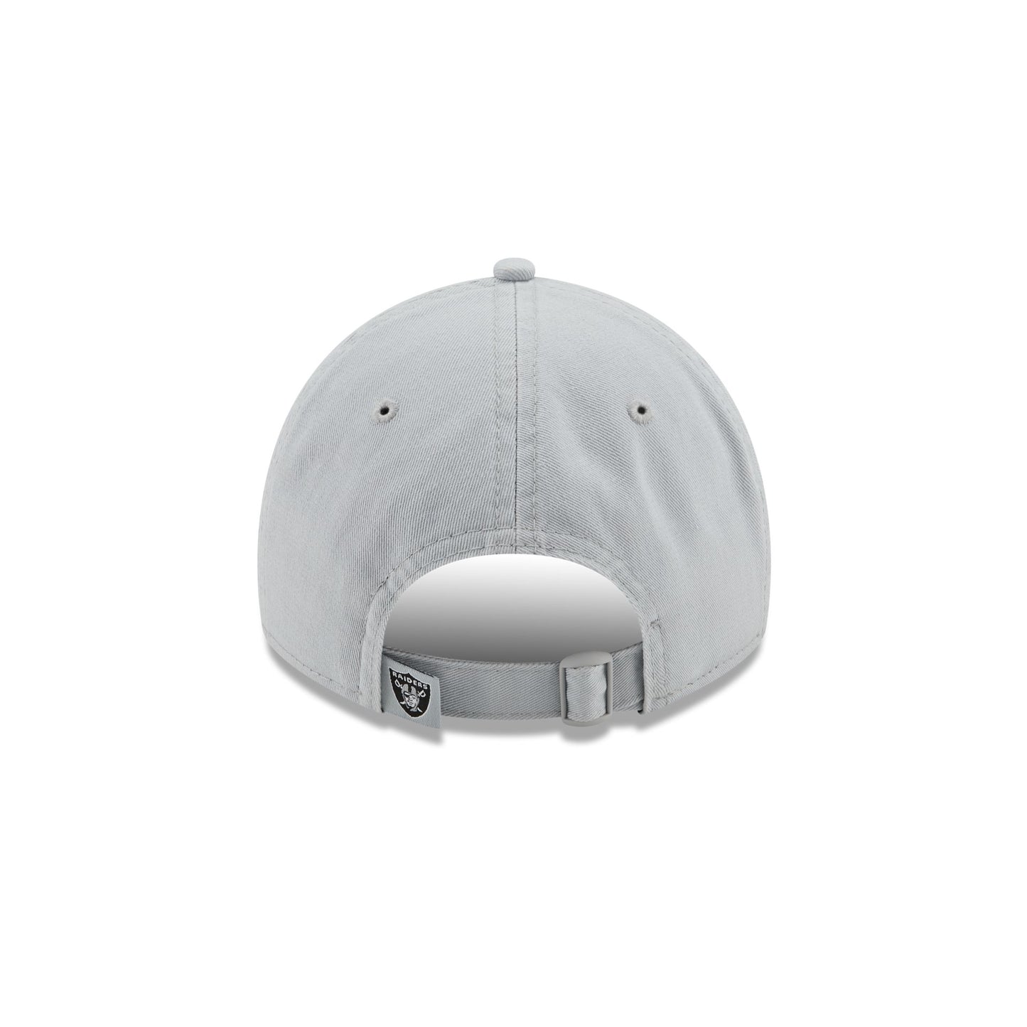 The Las Vegas Raiders Core Classic Gray 9TWENTY Adjustable Cap features an embroidered Raiders logo at the front panels with a woven tag displaying a team wordmark at an adjustable closure at the rear.