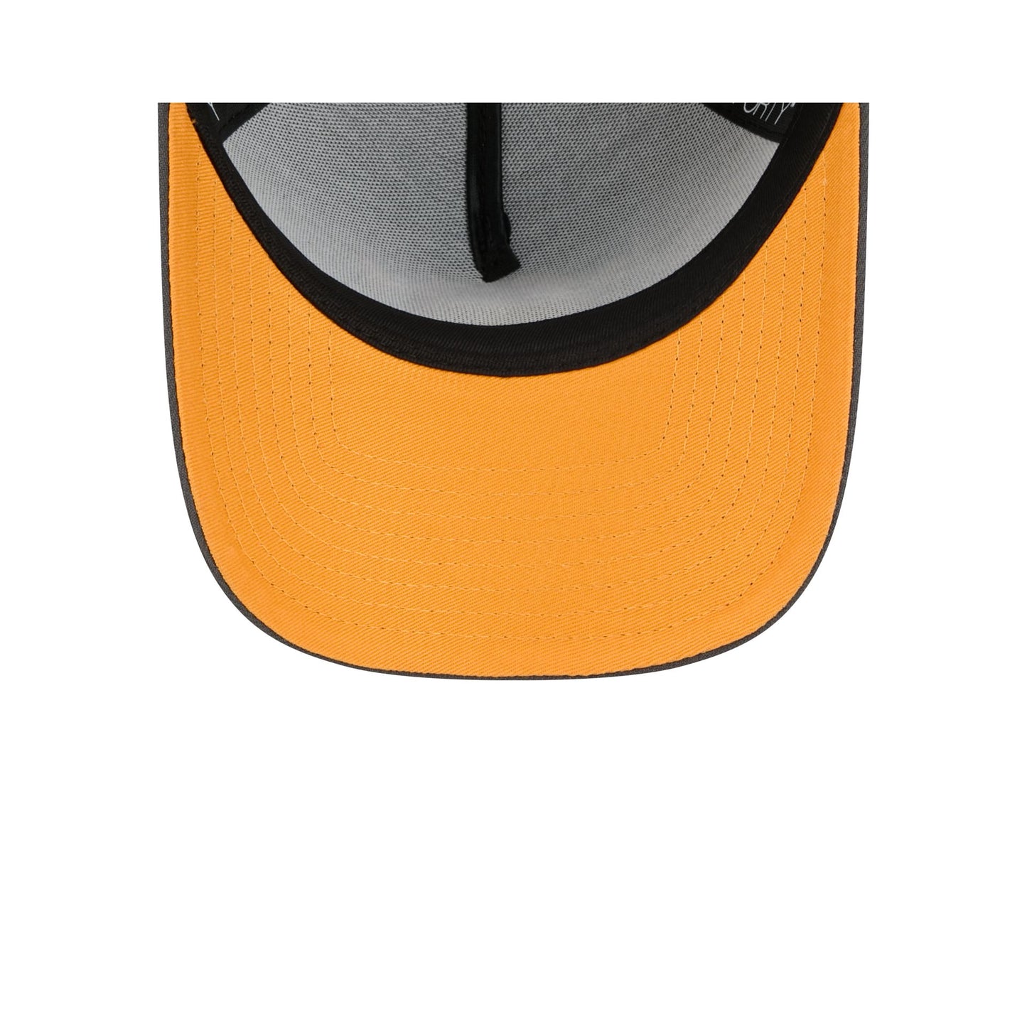 The Las Vegas Raiders Day of the Dead Graphite 9FORTY A-Frame Snapback features an embroidered Raiders logo at the front panels with marigold (cempasúchil) and hummingbird designs throughout, representing the Legend of Xóchitl and Huitzilin. Additional details include a team patch at the right-wear side and an adjustable snapback closure at the rear.