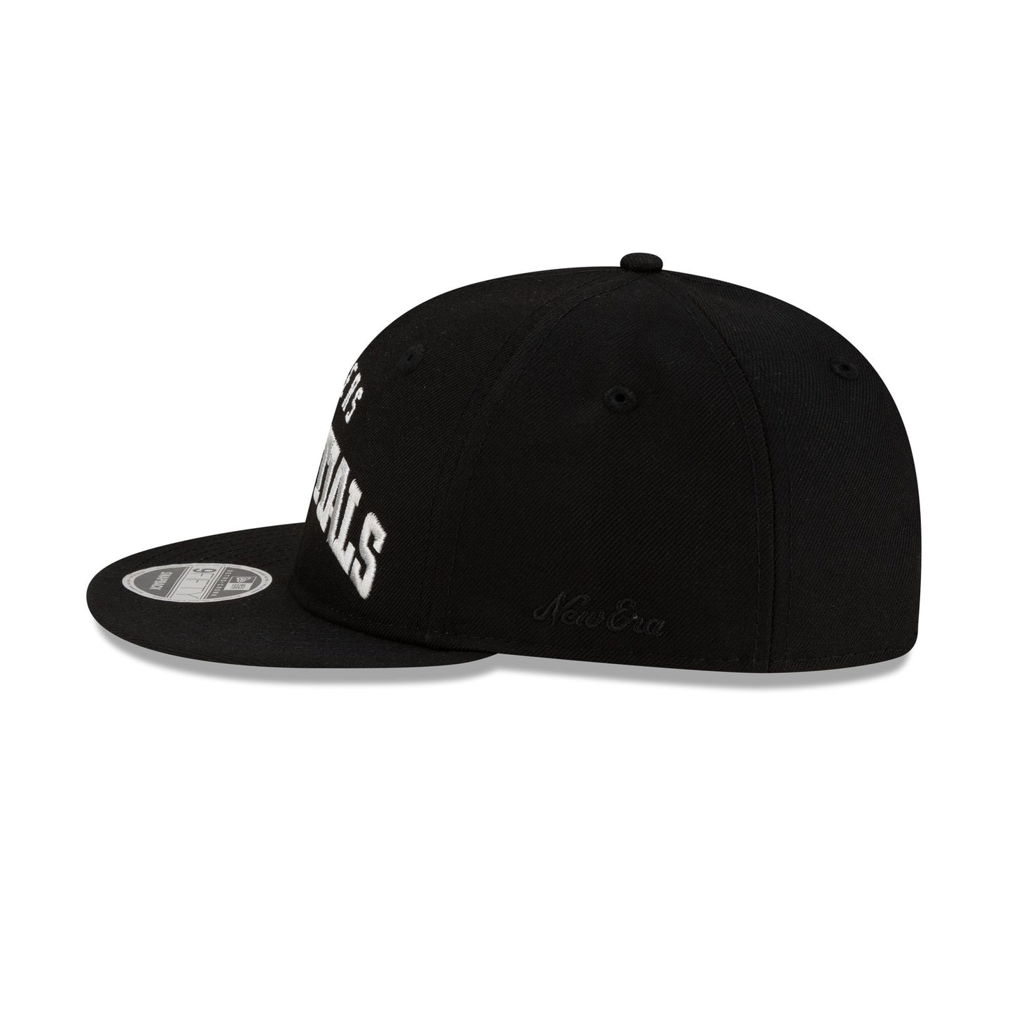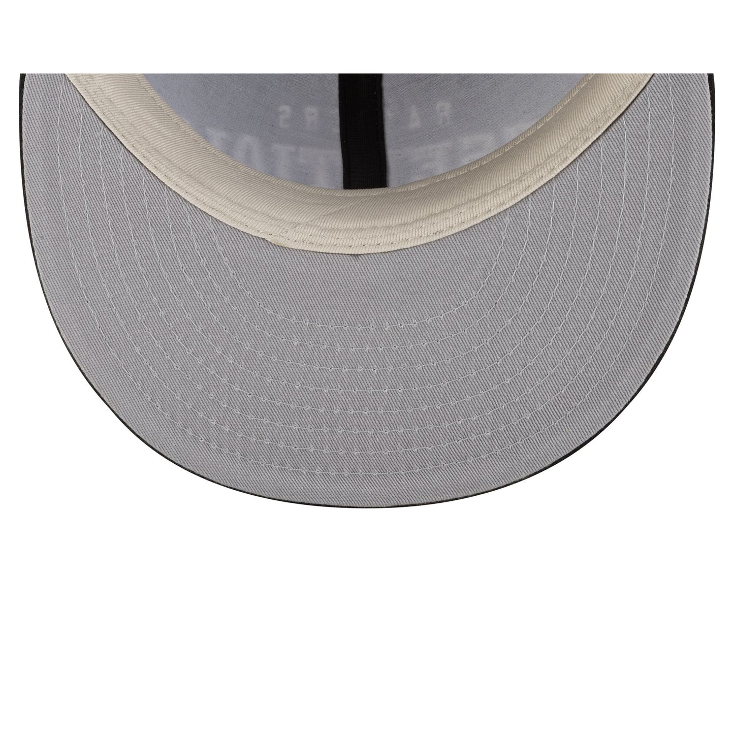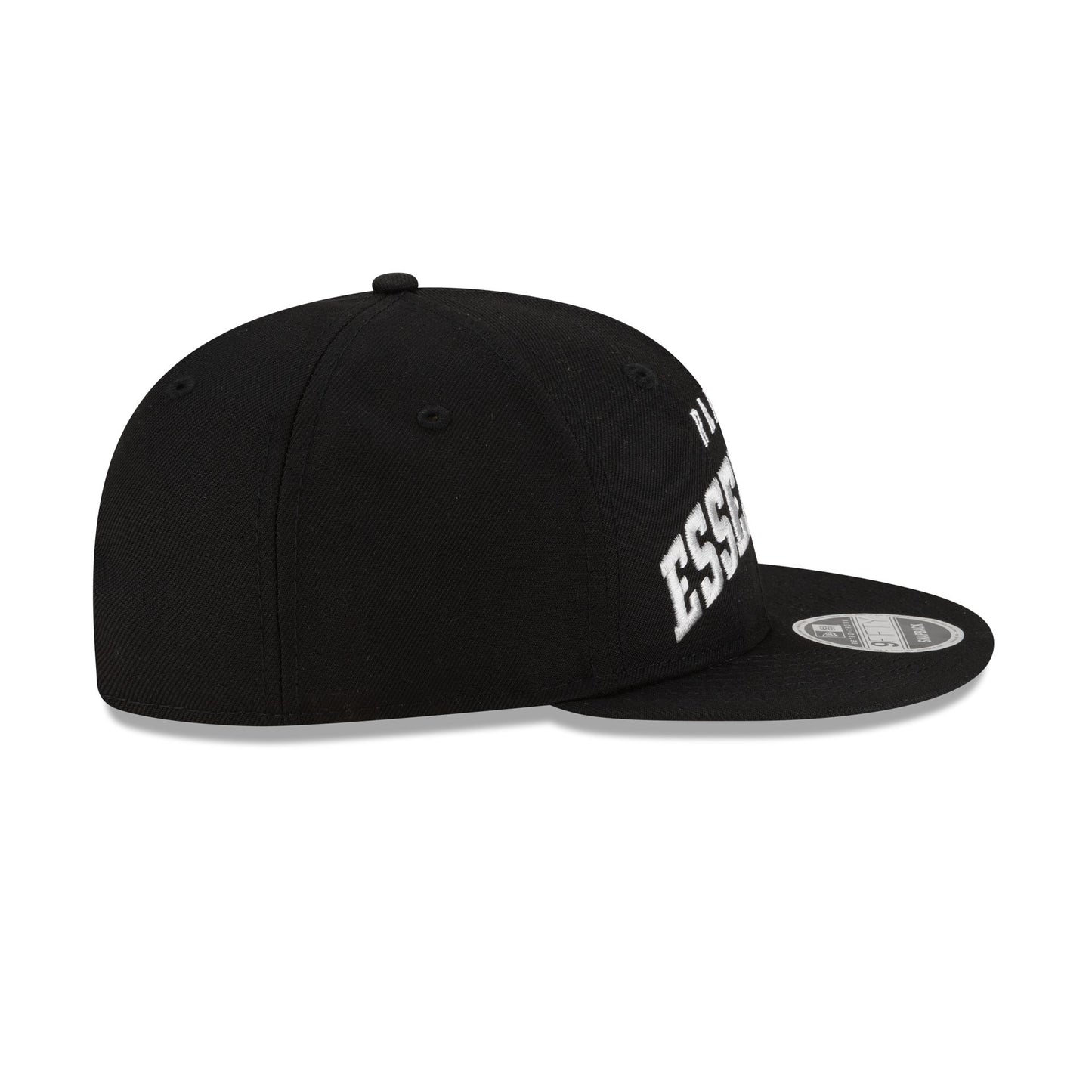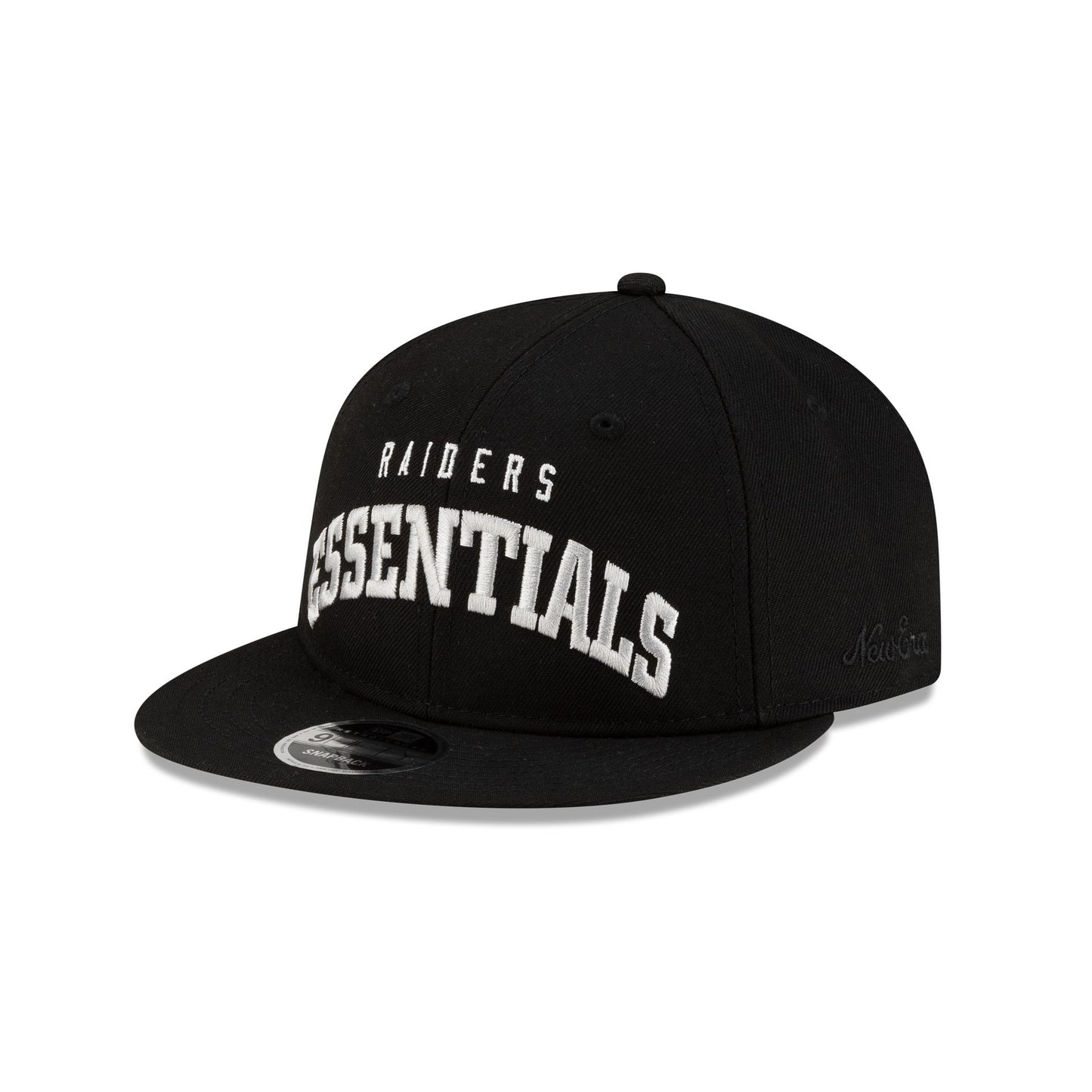 The Las Vegas Raiders Fear of God Essentials Retro Crown 9FIFTY Snapback features an embroidered Raiders Essentials wordmark at the front panels with a New Era script at the left-wear side and a team logo above an adjustable snapback closure at the rear.