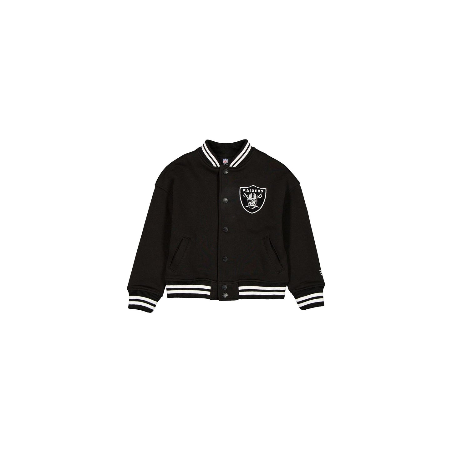 The Las Vegas Raiders Girls Jacket features a chenille Raiders logo at the left chest with a snap button closure and front pockets.